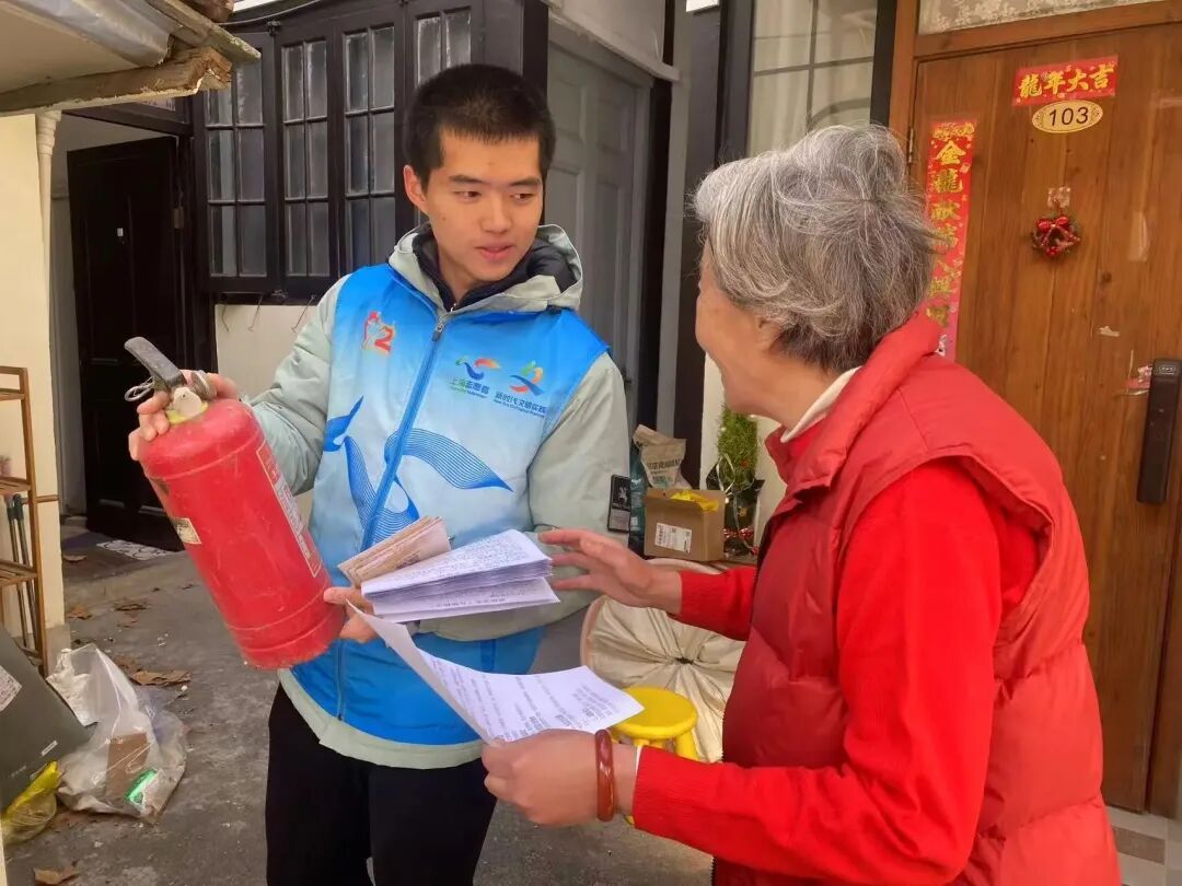 建新居民区的楼道整治现场,大学生志愿者们主动上门沟通,以热情与耐心化解部分居民的抵触情绪,用接地气的语言普及火灾隐患危害。永嘉新村、高安居民区的大学生志愿者将平安守护延伸至辖区商铺,通过发放灭火毯、动员店员加入平安志愿者队伍等举措,串联起“居民—商铺”的安全防线,织密社区平安防护网。
