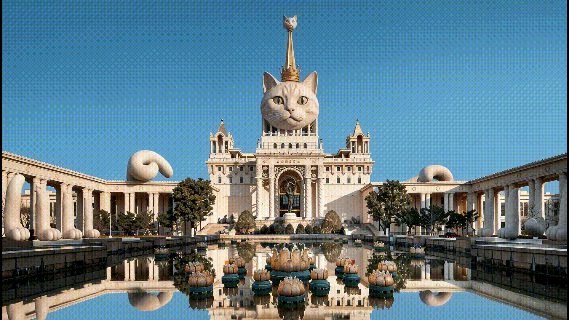 当喵星人悄然落脚静安,整座城市被温柔改写。我们以AI技术与韦斯安德森电影作品风格的结合,编织了一则关于优雅与包容的都市童话。镜头拂过静安寺的飞檐、友谊会堂的轮廓、张园的墙影——梧桐作猫道,光影为归处。这是对静安气质的宇宙级认证,亦是对一座城市吸引力与包容力的深情礼赞。