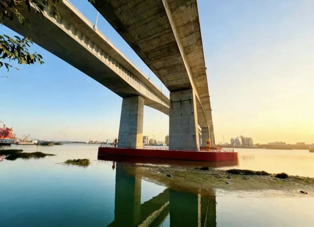 早晨,江面很平静,一轮红日从东方冉冉升起,把整条大江照得红彤彤的。阳光给江水披上了金色的盛装。远处大桥水面静卧,温柔地托起整座城市的倒影,在微漾的波光中,仿佛都市在梦中轻喘。