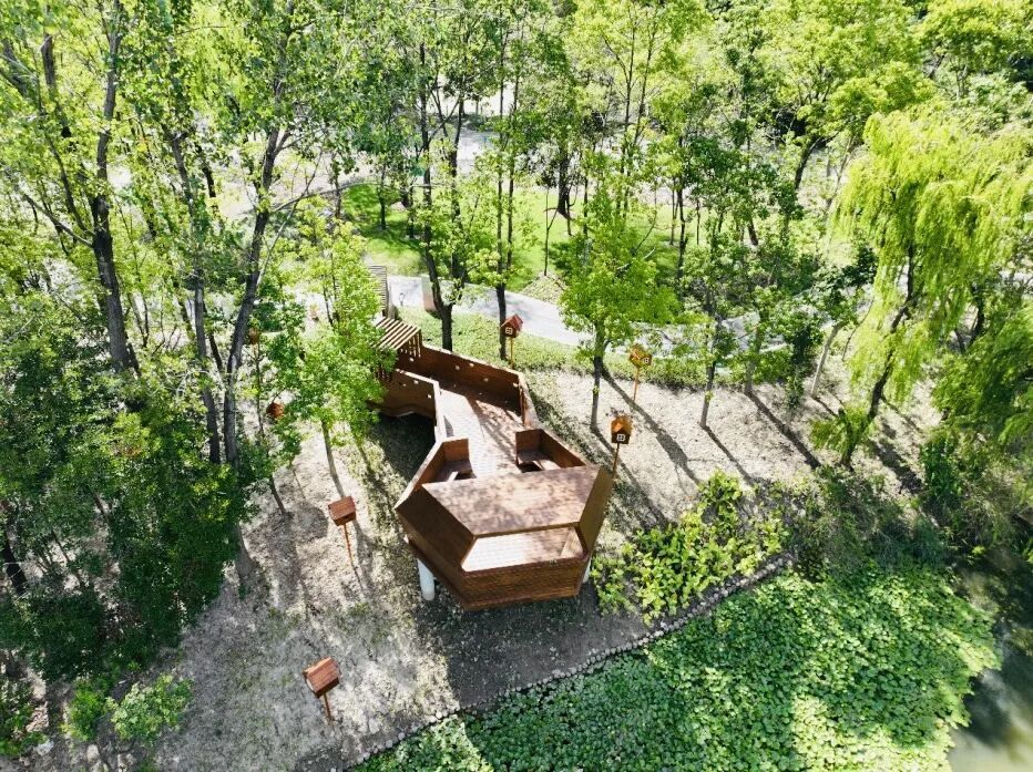 公园利用林下开敞空间,以低干预设计,设置观鸟平台。同时,结合现状生态资源,设置以莲子元素进行设计的半围合构筑,打造静谧闲适的林下休憩空间。