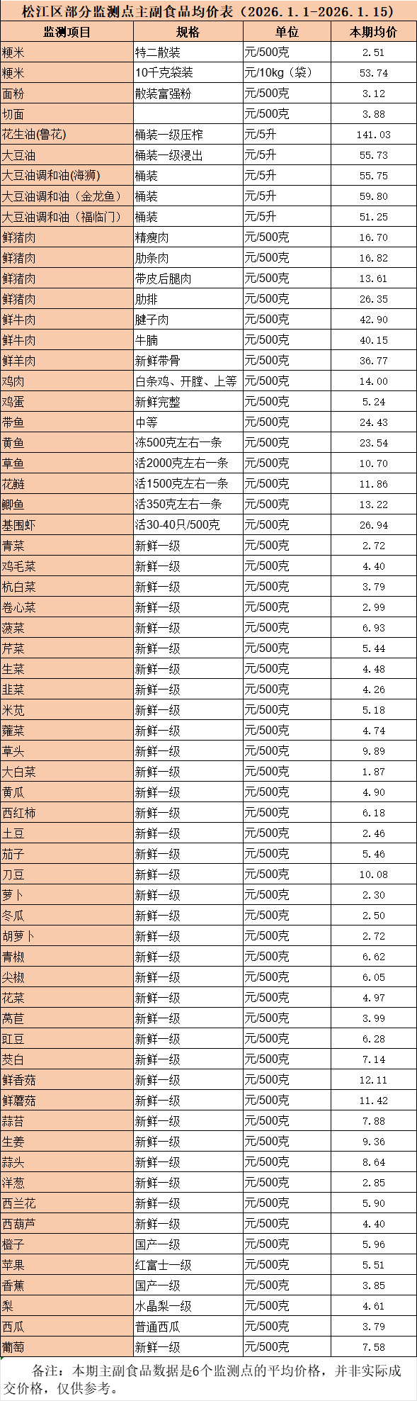 松江区部分监测点主副食品均价表(2026.1.1-2026.1.15)