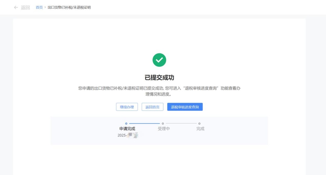 申请提交成功后,纳税人可通过【我要查询】-【出口退税相关信息查询】-【退税审核进度查询】,事项名称选择【出口货物已补税/未退税证明】,查询证明的审核状态。