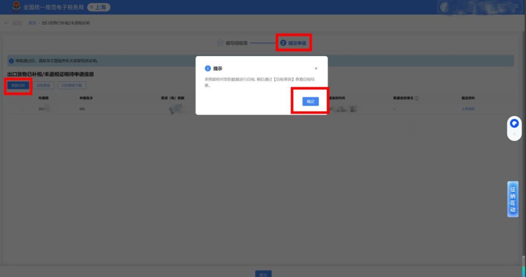 进入【提交申请】界面,勾选数据,点击【数据自检】按钮。
