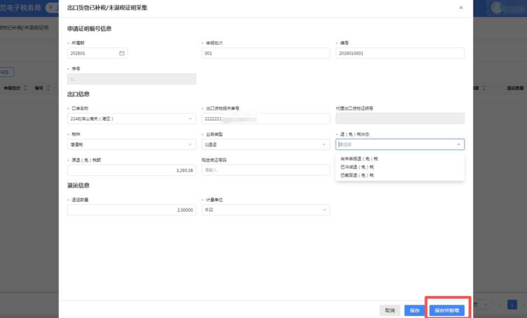 如您的报关单还没申报过出口退(免)税,直接把【退(免)税状态】选为“尚未申报退(免)税”,补填好准确的退运相关信息,就能完成保存。