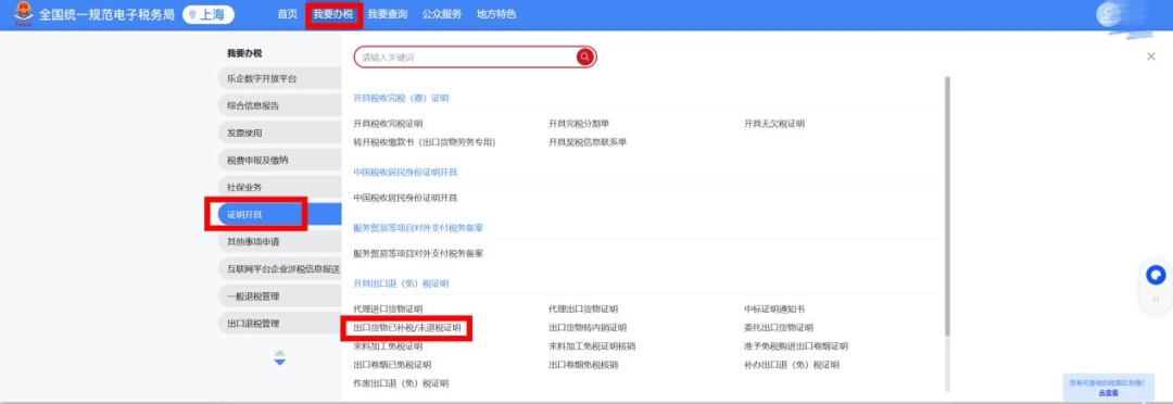 登录电子税务局后,依次点击【我要办税】→【证明开具】→【出口货物已补税/未退税证明】,就能进入申请页面啦。