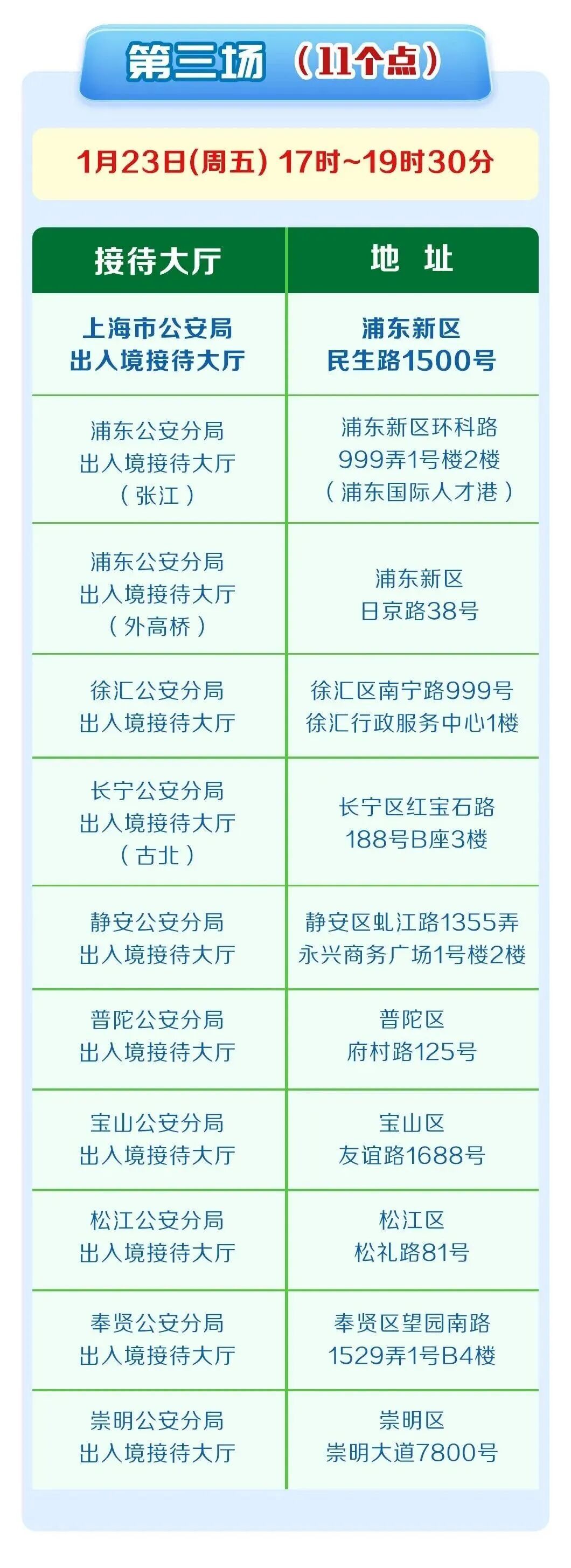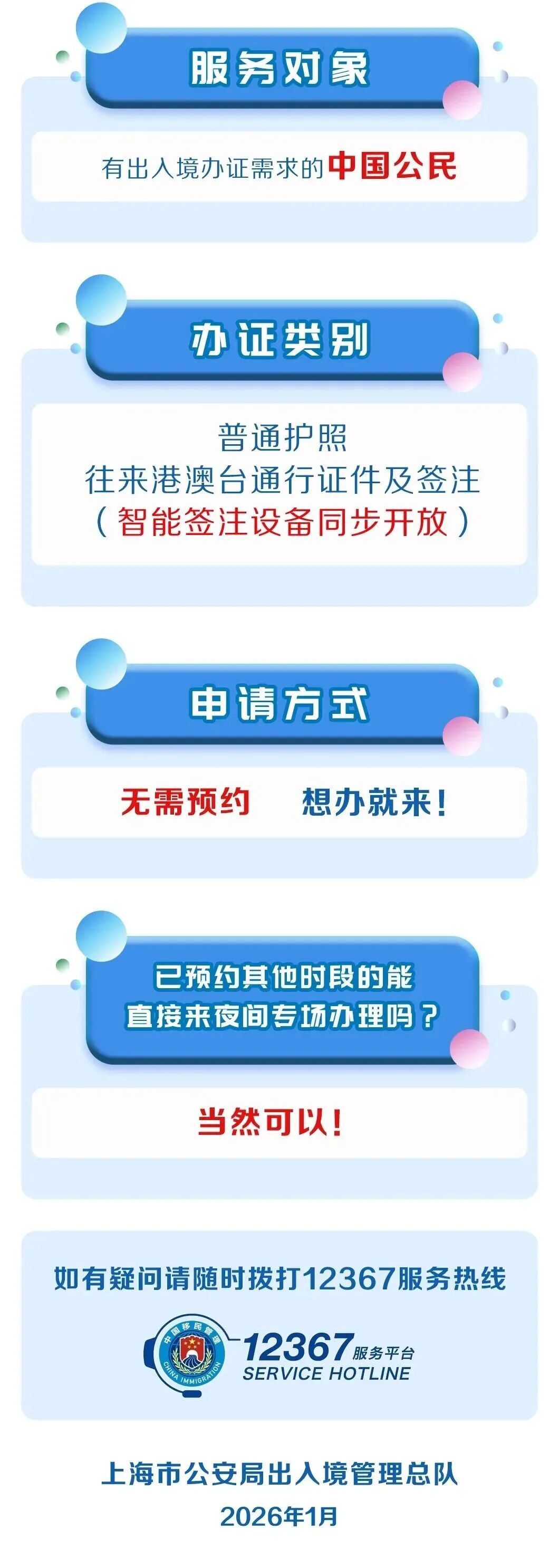 全市出入境接待大厅于2026年1月9日、16日、23日连续三个周五分批开设中国公民出入境办证夜间专场,统一延时开放至19时30分满足群众寒假春节前办证需求。具体场次安排为:1月9日晚,全市20个出入境接待大厅全部开放;1月16日晚,开放浦东(临港)、黄浦、长宁(临空)、虹口、杨浦、闵行、嘉定、金山、青浦和市出入境接待大厅共10个点位;1月23日晚,开放浦东(张江、外高桥)、徐汇、长宁(古北)、静安、普陀、宝山、松江、奉贤、崇明和市出入境接待大厅共11个点位。