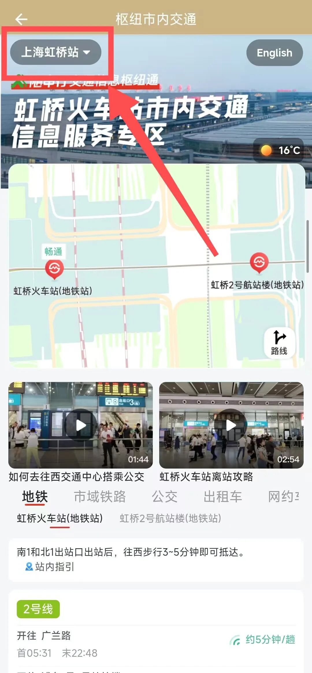 进入专区后,在界面上可以看到左上角的选站按钮,点开选站按钮即可看到上海的各大站点,选择「上海虹桥站」。