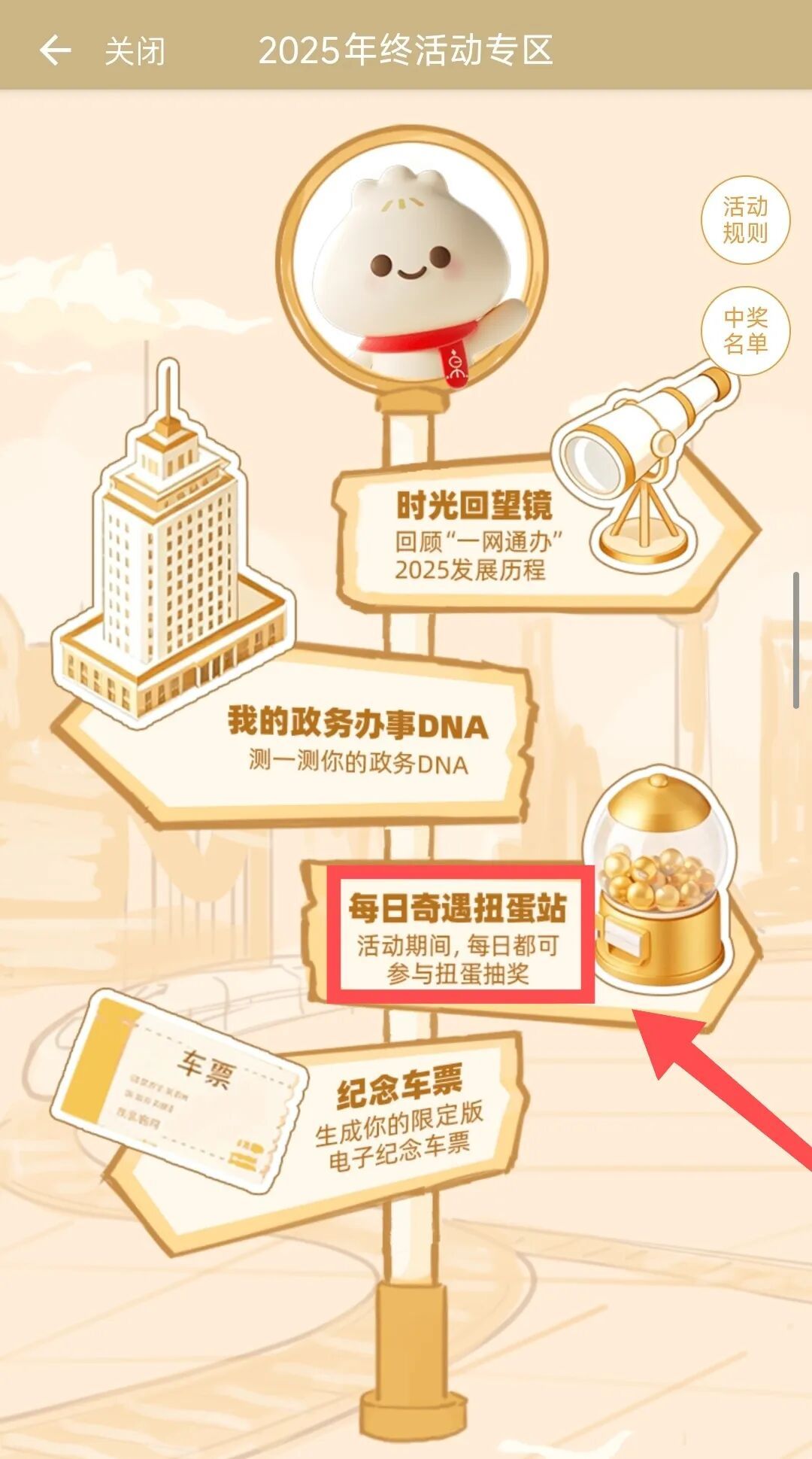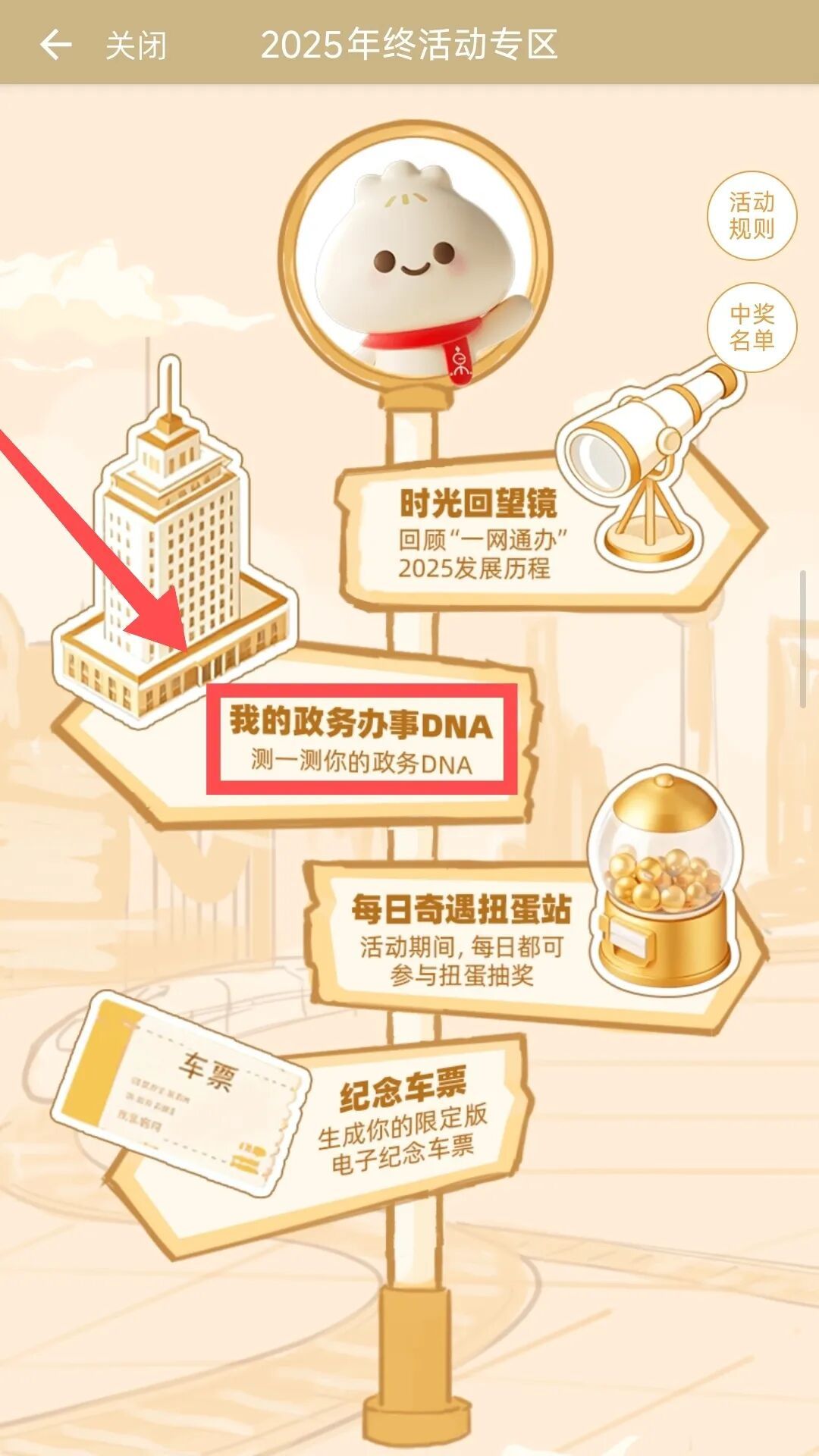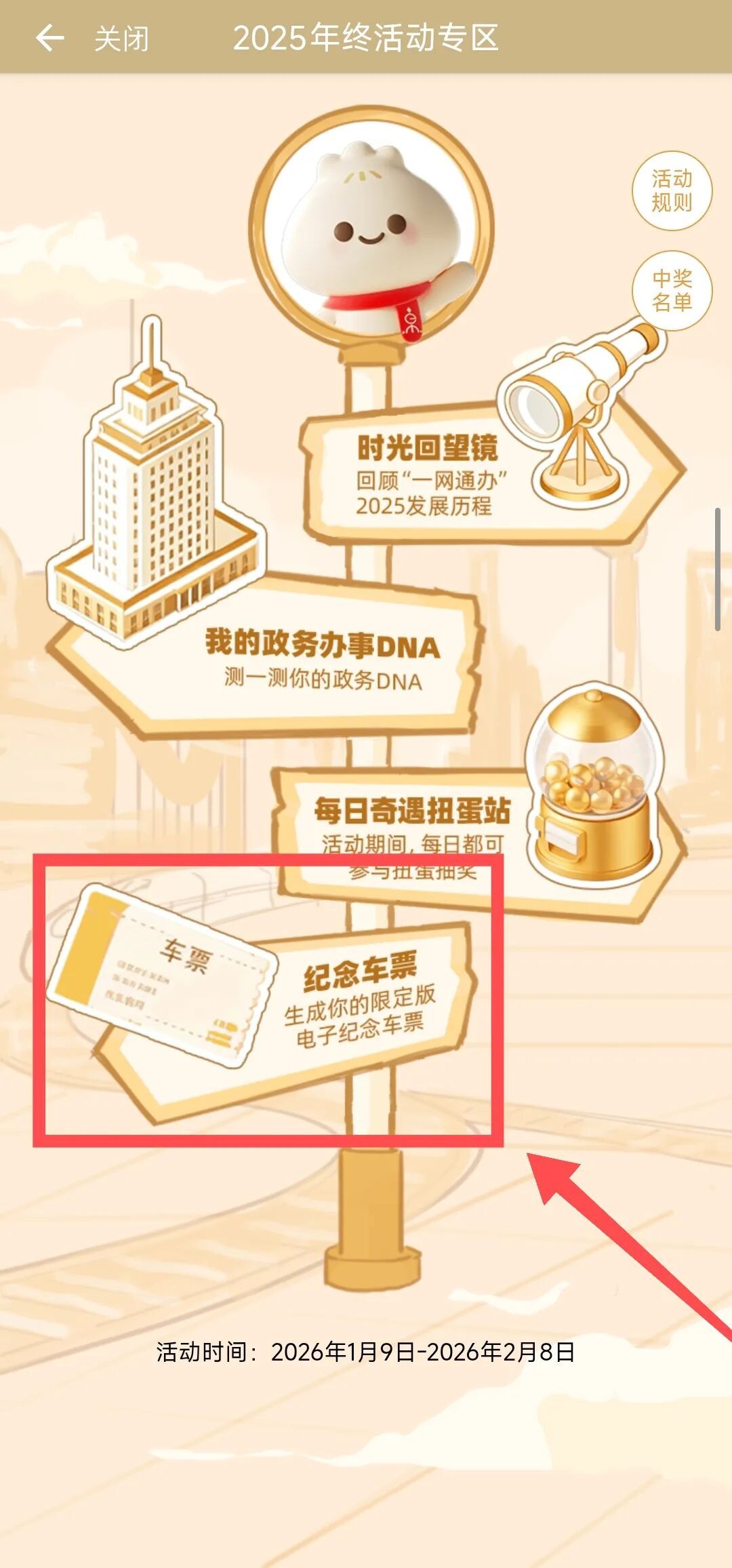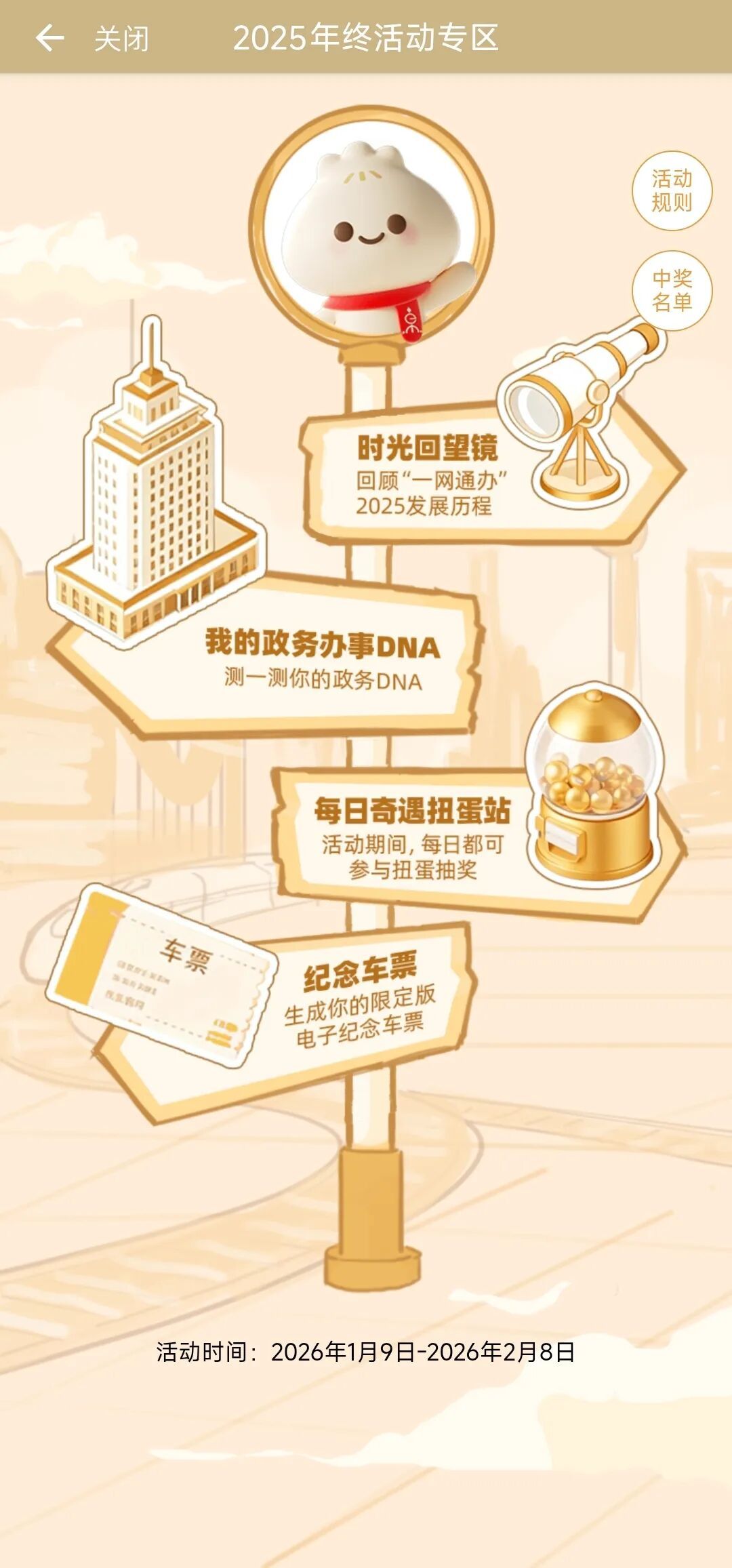 本次您将跟随小申一起,搭乘一趟"开往新年的时光列车",一起解锁“时光回望镜”回顾过去一年您的服务使用数据,一起测试您的政务办事DNA、一起启动每日扭蛋机参与抽奖,一起领取旅程纪念票,为回忆画上圆满的句号~