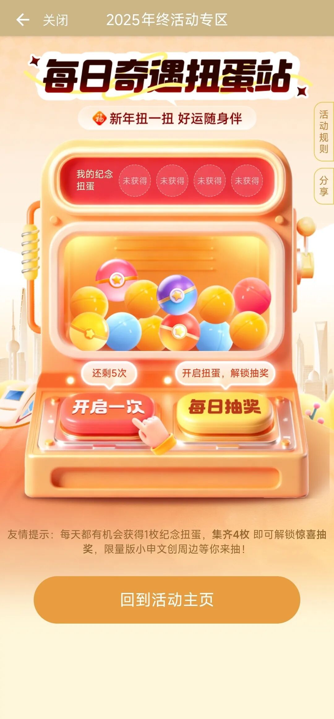 操作指南:点击“开启一次”按钮可抽取扭蛋,点击右侧“每日抽奖”按钮即可参加抽奖。集齐4个纪念扭蛋,可以再解锁一次大奖抽奖(纪念奖池)机会。