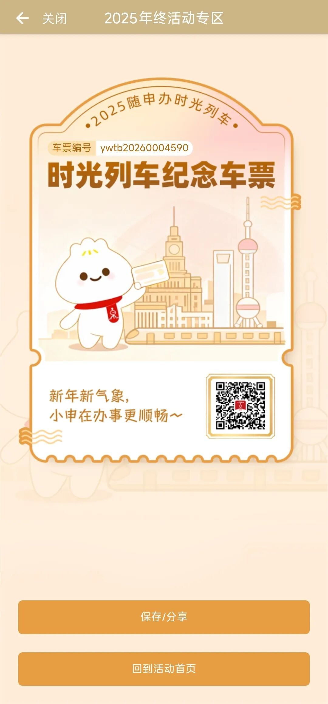 作为活动"时光列车"主线的终点站,本环节为您提供限定版电子纪念车票,承载旅程记忆,又寄托未来期许。您可以一键保存车票或分享至社交平台,邀请朋友一同参与活动,抽取惊喜好礼~