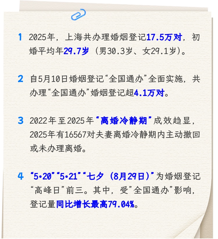 市民政局介绍,2025年,全市共办理婚姻登记175092对,全市初婚平均年龄29.7岁。2025年上海婚姻登记数据详见↓