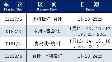 据上海铁路客户服务中心介绍,根据旅客出行需求,铁路部门增开和恢复开行了部分旅客列车。增开列车包括G9268(上海虹桥—南京南)、G9301(上海虹桥—杭州东)等;恢复开行列车包括K1127/6(上海松江—襄阳)、D182/3(杭州—青岛北)等。赶快过来看看有没有您需要的车次吧!详见↓