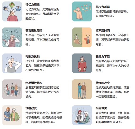 阿尔茨海默病作为老年人常见的中枢神经系统退行性疾病,以认知障碍、精神行为异常及日常生活能力下降为核心特征,且一旦发病便难以逆转,常隐匿性进行性加重。患者早期常常有以下症状: