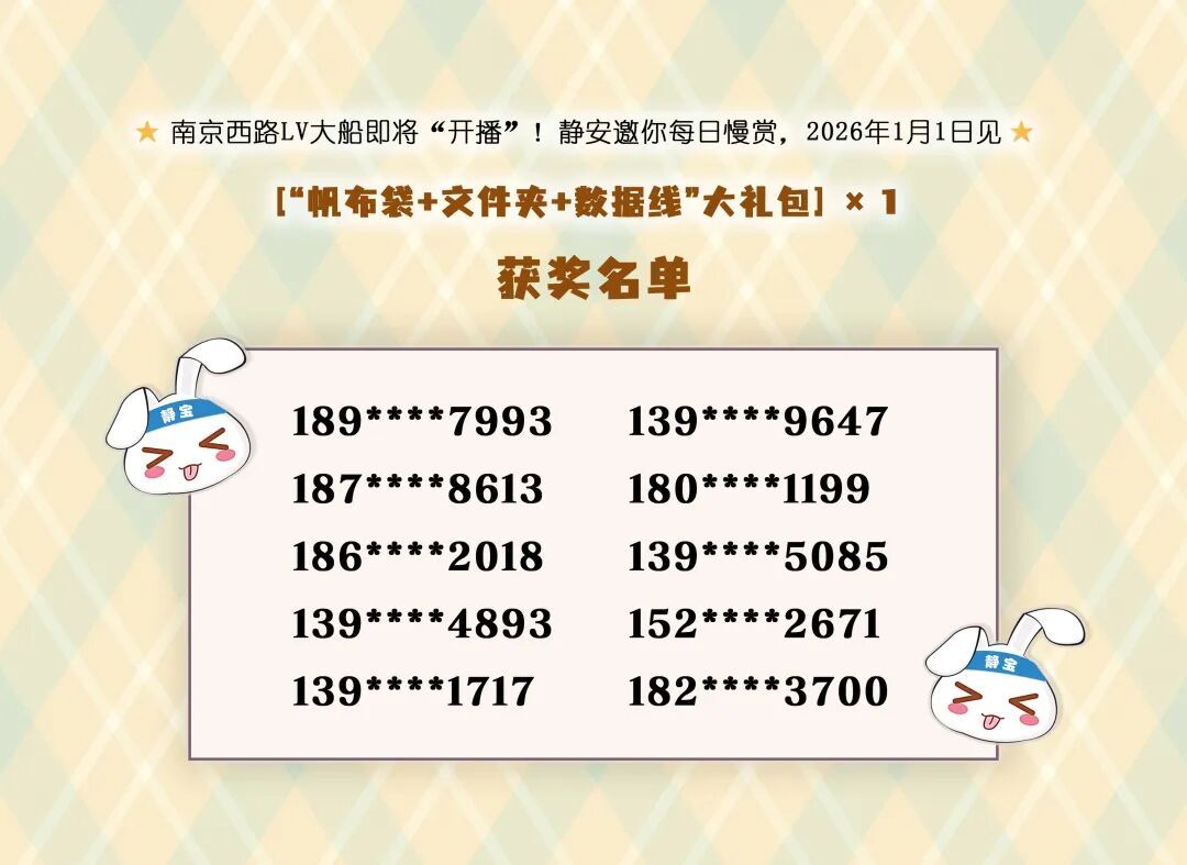 此前静宝推送的《南京西路LV大船即将“开播”!静安邀你每日慢赏,2026年1月1日见》中奖名单已经出炉!详见↓