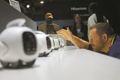 1月7日,一名男子在美国拉斯维加斯消费电子展海信展台观看搭载新一代AI智能识别引擎的陪伴机器人。 新华社 发