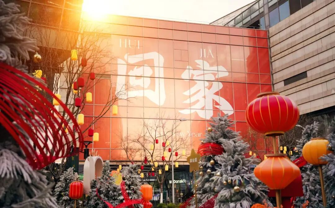 现场可以看到,高达11米的鎏光花火树闪耀,天街里街区2000平方米内千盏灯笼亮起,车辆驶过申长路,AB馆连廊间的“回家”大画映入眼帘。