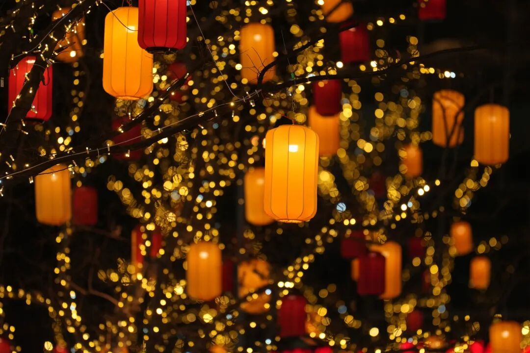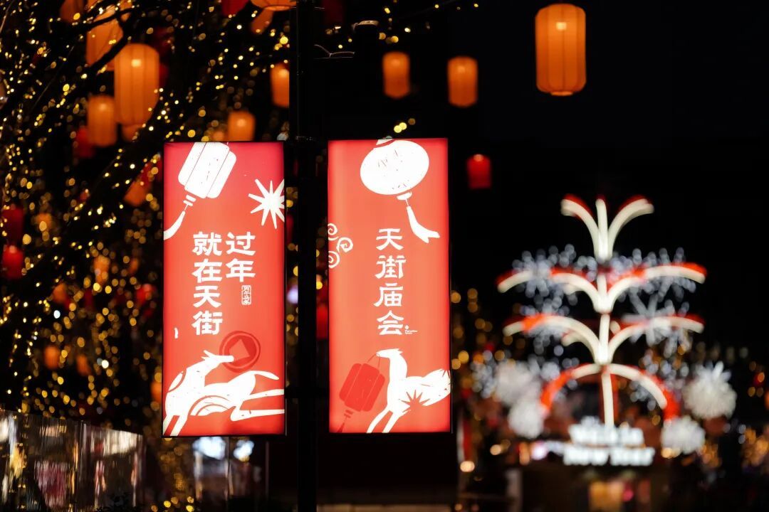 巨型鎏光花火树散发着金色光芒,照亮整条街道的灯笼轻轻摇曳,火红的年味已悄然笼罩。近日,位于闵行区新虹街道的虹桥天街室外,一年一度的“天街庙会”再次归来。