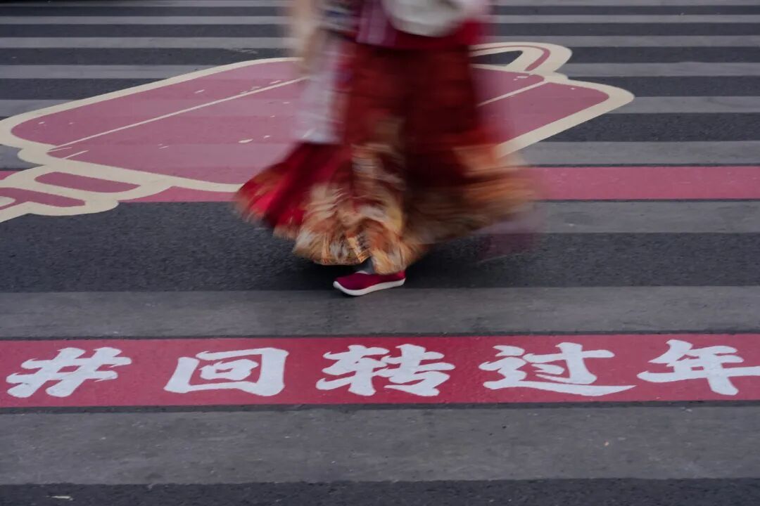 值得注意的是,虹桥天街在A馆与B馆之间的申长路斑马线上,限时增添了创意斑马线“回转过年”,意为上海话谐音“回家过年”。“一句乡音暖归途,我们希望用色彩与声音的形式来校准上海‘年’的路标,也是对所有在外打拼的上海游子说一句‘欢迎回家’。”