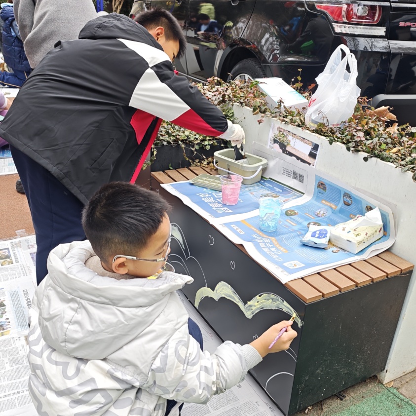 这些充满童真的图案,不仅是孩子们的“艺术创作”,更让空间的意义悄然转变:冰冷的座椅化作承载童真的画布,功能性的乐园升级为凝聚情感的社区客厅。居民们在此驻足,欣赏的不仅是童趣,更是被看见、被珍视的社区情感。