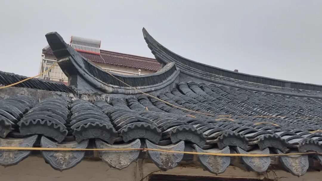 在吕巷镇马新村,一栋有别于周边民宅的老建筑静静矗立在路边,黑砖白墙带着岁月的痕迹,独特的庑殿式大屋顶正脊弯曲、两端翘起,格外引人注目。