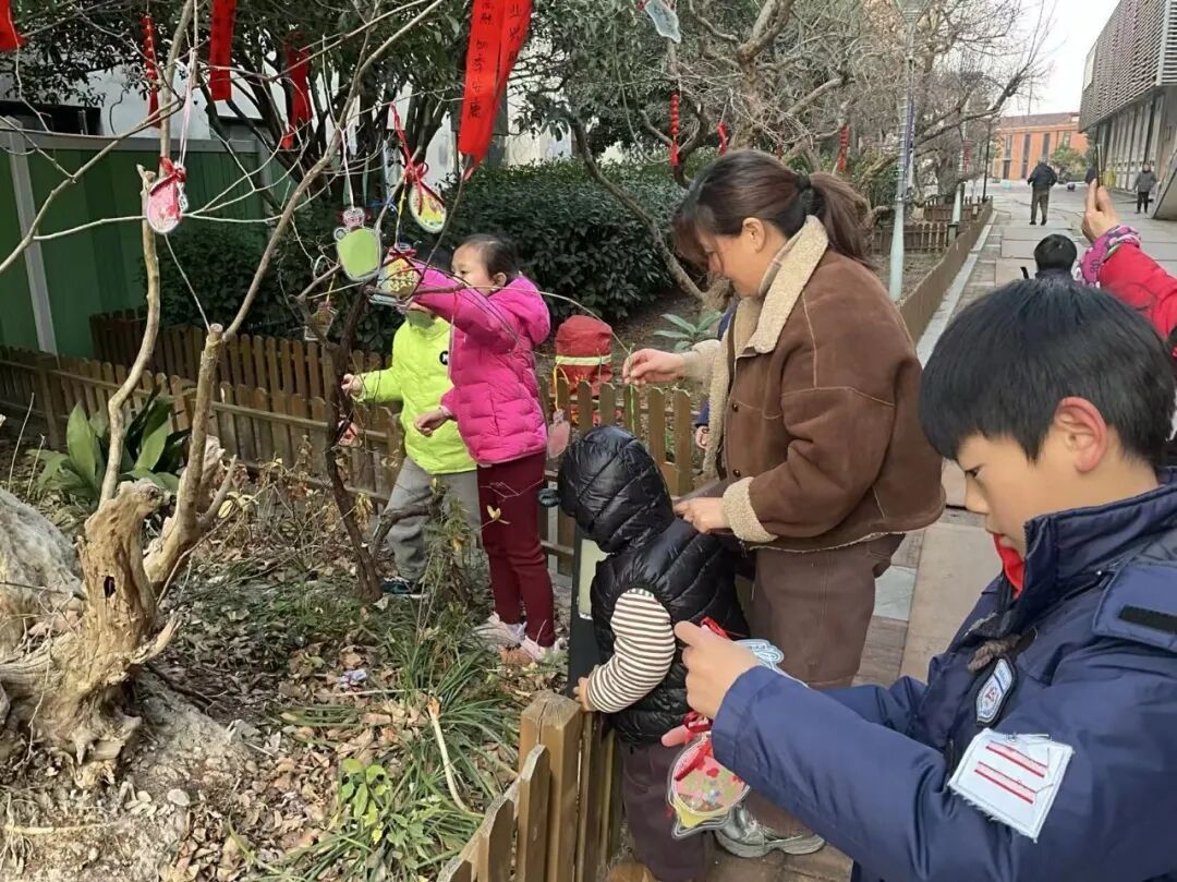 活动尾声,小朋友们捧着精心绘制的许愿签,在工作人员的带领下前往驿站门口,将许愿签系在挂满红飘带的树枝上。风一吹,彩色卡纸与红飘带轻轻摇曳,宛如一串串承载着期盼的小灯笼,成为驿站门前花园里最温暖的风景线。随后,孩子们还主动参与公益服务,与志愿者一同将多余的许愿签和10根生机勃勃的富贵竹打包,送到十七二社区居委会,并协助工作人员布置在小区花园中,让未能到场的邻居们也能感受到节日的暖意与社区的关怀。这份“小手传大爱”的公益行动,不仅拉近了社区邻里间的距离,更让“两企三新”人员子女在实践中体会到参与社区治理的价值与意义。