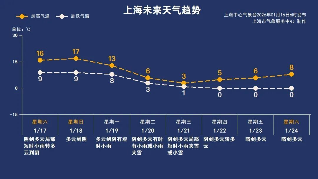 1月17日(周六):阴到多云局部短时小雨转多云到阴,9~16℃