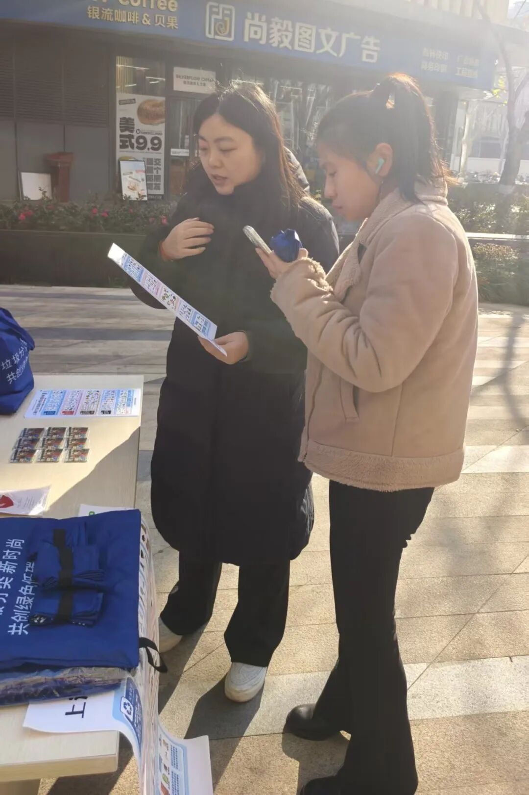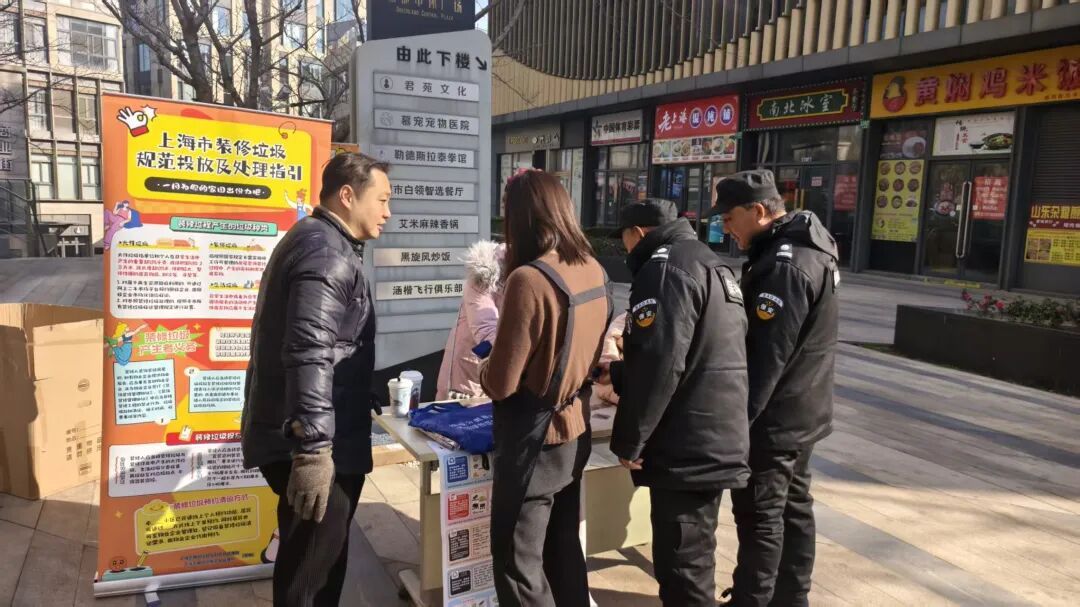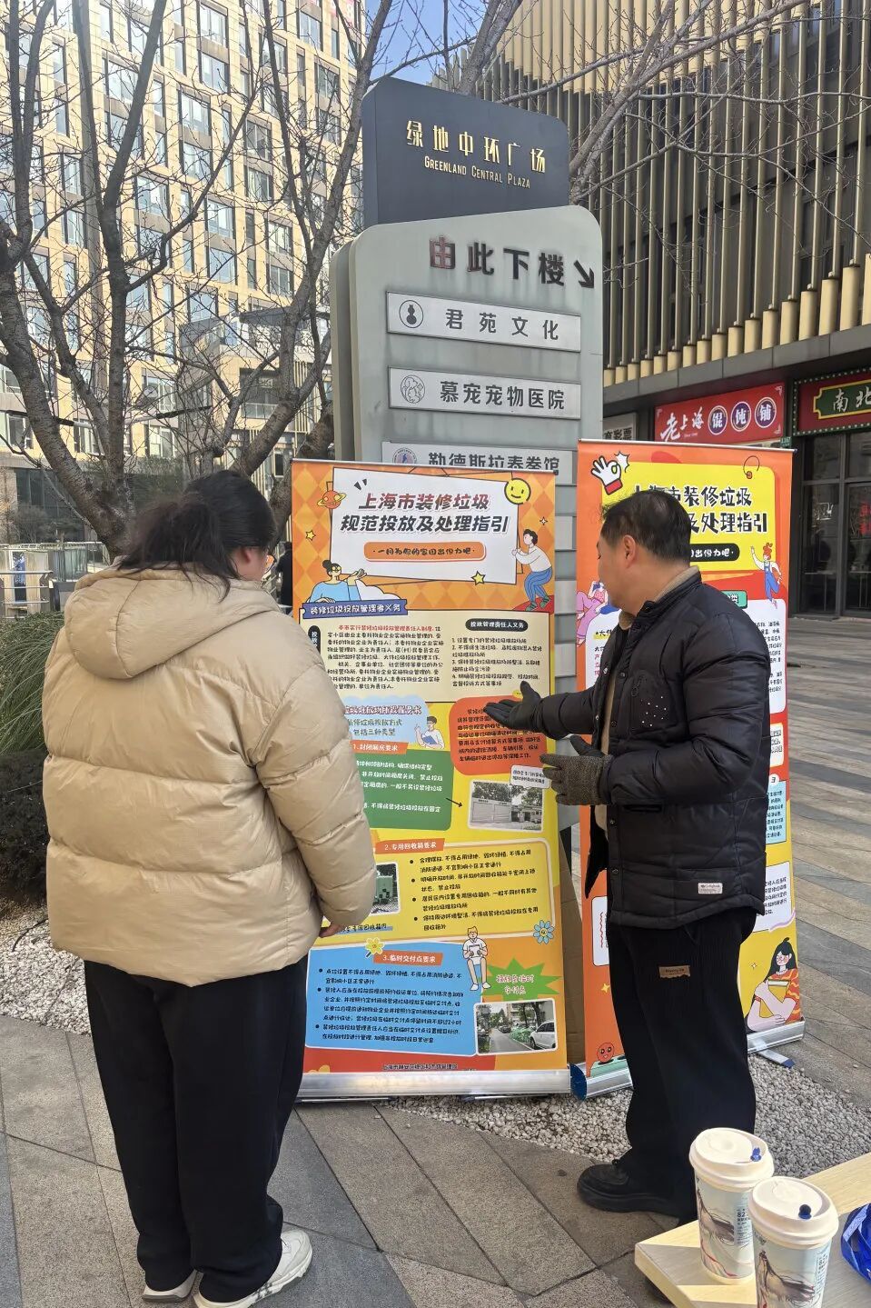 活动现场,街道工作人员与志愿者结合商务楼宇特点,采取了灵活的宣传方式。除了在公共区域设立固定宣传点,为来往白领解答日常分类困惑、为园区物业宣传建筑垃圾清运规范外,还特别组织了小队,主动走访广场内多家商铺。