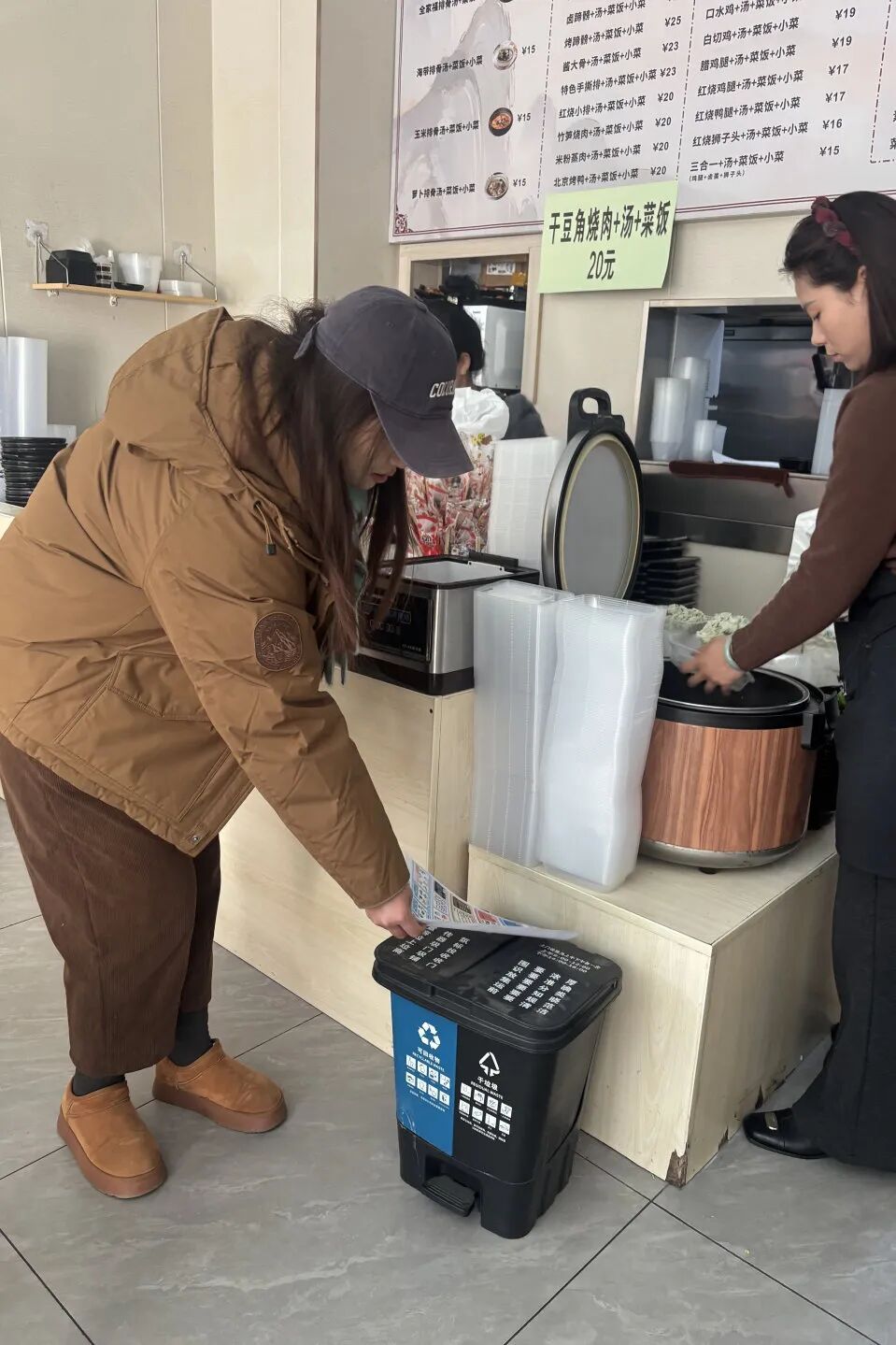 针对商户在经营中容易产生的垃圾,如餐饮店的餐厨垃圾、零售店的包装物等,志愿者们提供了具体的分类指导和操作建议。为此类活动特别定制的便携式干/可回收物垃圾桶,因其小巧实用,受到了商户的普遍认可,解决了店内分类容器不便摆放的实际问题。