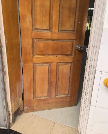 石湖荡敬老院木质门体因长期受潮、虫蛀,门框和门体均出现不同程度的腐烂,有表皮脱落、内部霉变等现象。为提升居住舒适度,对敬老院居住房间、护理站、库房共计53套房门和门框进行更新改造。