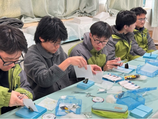 实操环节中,在蒋老师的专业指导下,同学们有条不紊地动手制作蝴蝶与甲虫展翅标本。从小心翼翼调整虫体姿态,生怕碰损细微结构,到精准固定翅膀位置,力求呈现最自然的形态,再到耐心等待标本成型,每一个步骤都饱含专注与严谨。沉浸式的实操体验中,同学们不仅熟练掌握了标本制作技术,更亲身亲历了从野外采集到标本成型的完整科学流程。原本抽象的“生物分类特征”,通过亲手操作变得具象可感,进一步点燃了大家对昆虫研究与生物多样性保护的浓厚兴趣。