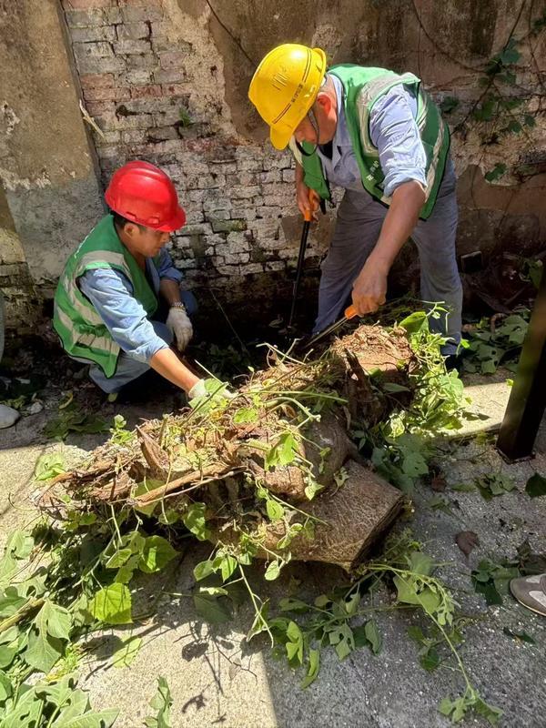面对这一交织着安全、民生与法律的治理难题,街道会同区绿化市容局、房管局、财政局、城管执法局及永业集团(其下属卢湾公房公司、金锐建设公司)组建了工作专班。各部门的紧密协作,为破解困局提供了关键支撑:绿化部门依法完成权属认定,明确了公房、私房、商品房等不同区域树木的养护责任主体;房管和财政部门共同落实了整治与长效养护的资金渠道;执法部门则强化了监督保障。