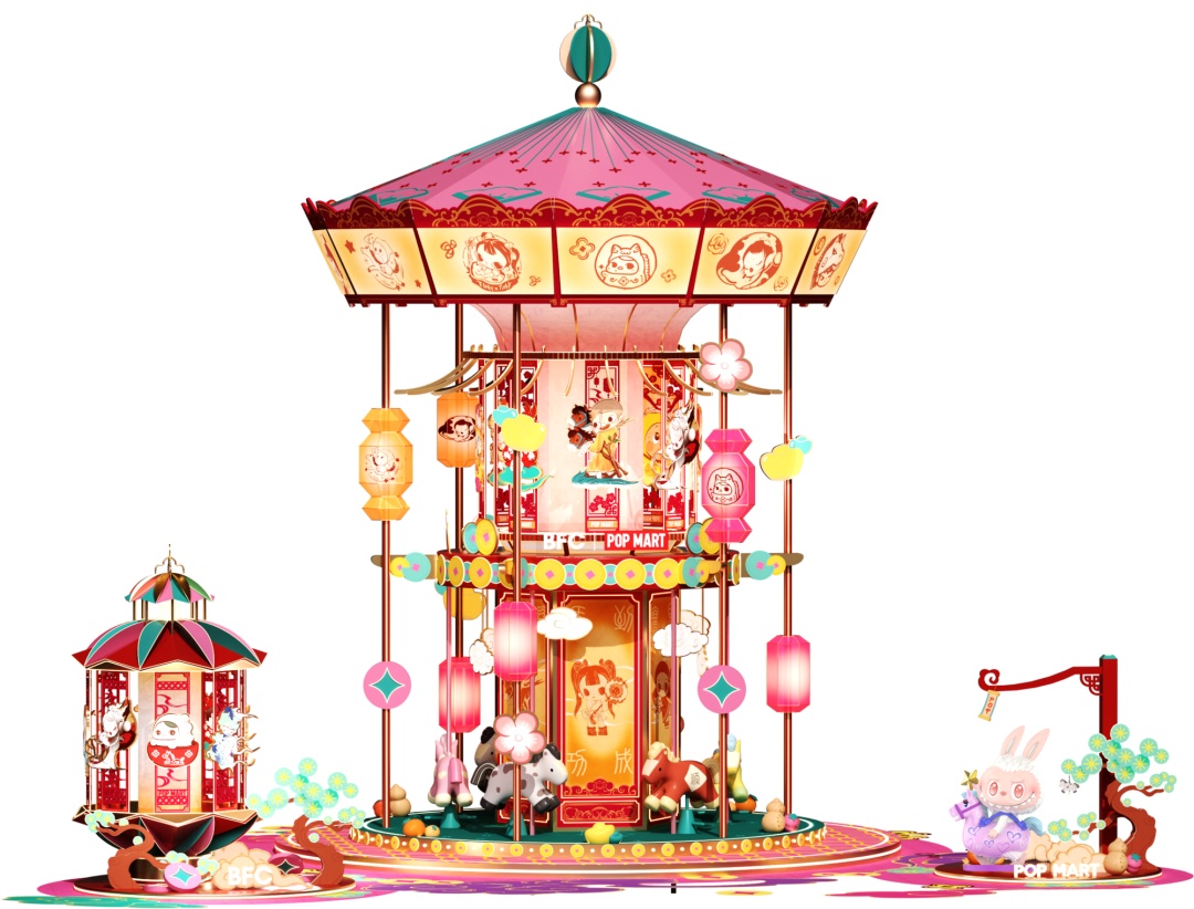 步入BFC北区广场,一座别出心裁的宫灯旋转木马装置瞬间点亮新春夜空。传统宫灯的朱红飞檐下,暖黄灯箱勾勒出12个泡泡玛特经典IP形象,下层木马在光影中交织出马年奔腾的意象,宫灯一侧,LABUBU的萌趣灯组与旋转木马相映成趣。