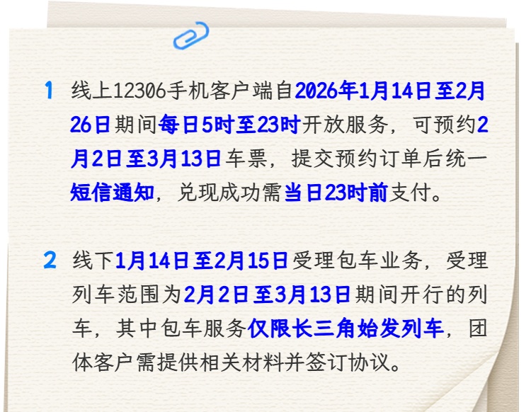 受理列车范围为2026年2月2日至3月13日期间开行的列车,其中包车服务仅限长三角始发列车;整车包车为增开列车;团体客户可自选日期、车次、发到站、席别(限硬座、二等座、二等卧);