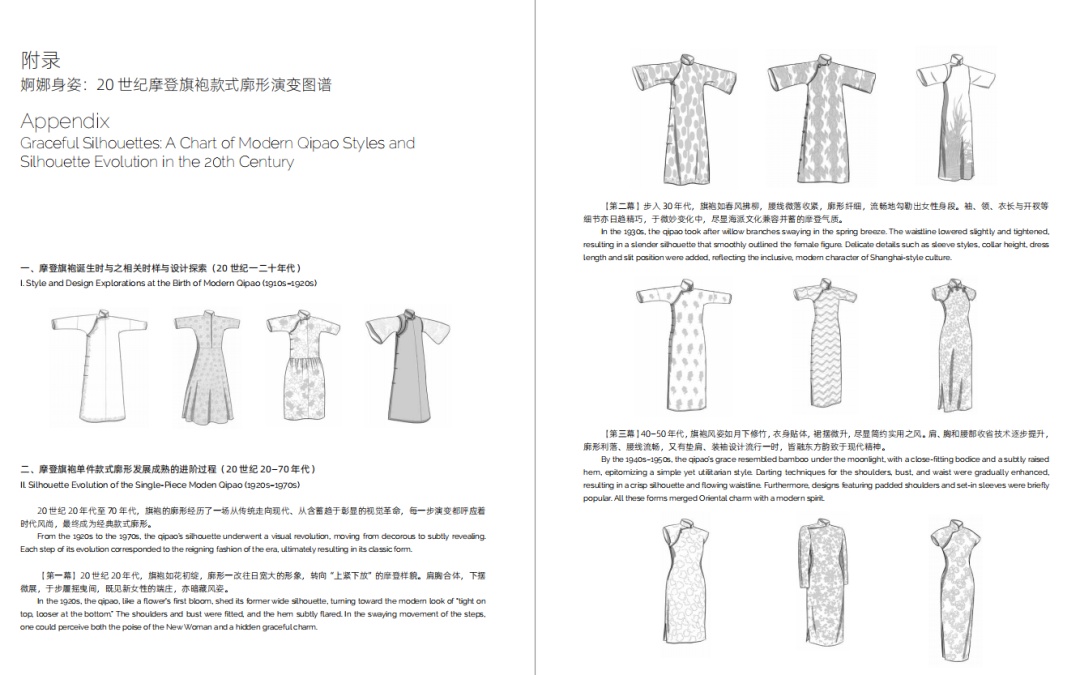附录《婀娜身姿:20 世纪摩登旗袍款式廓形演变图谱》则以线描图的方式展示了20世纪旗袍款式的廓形演变。