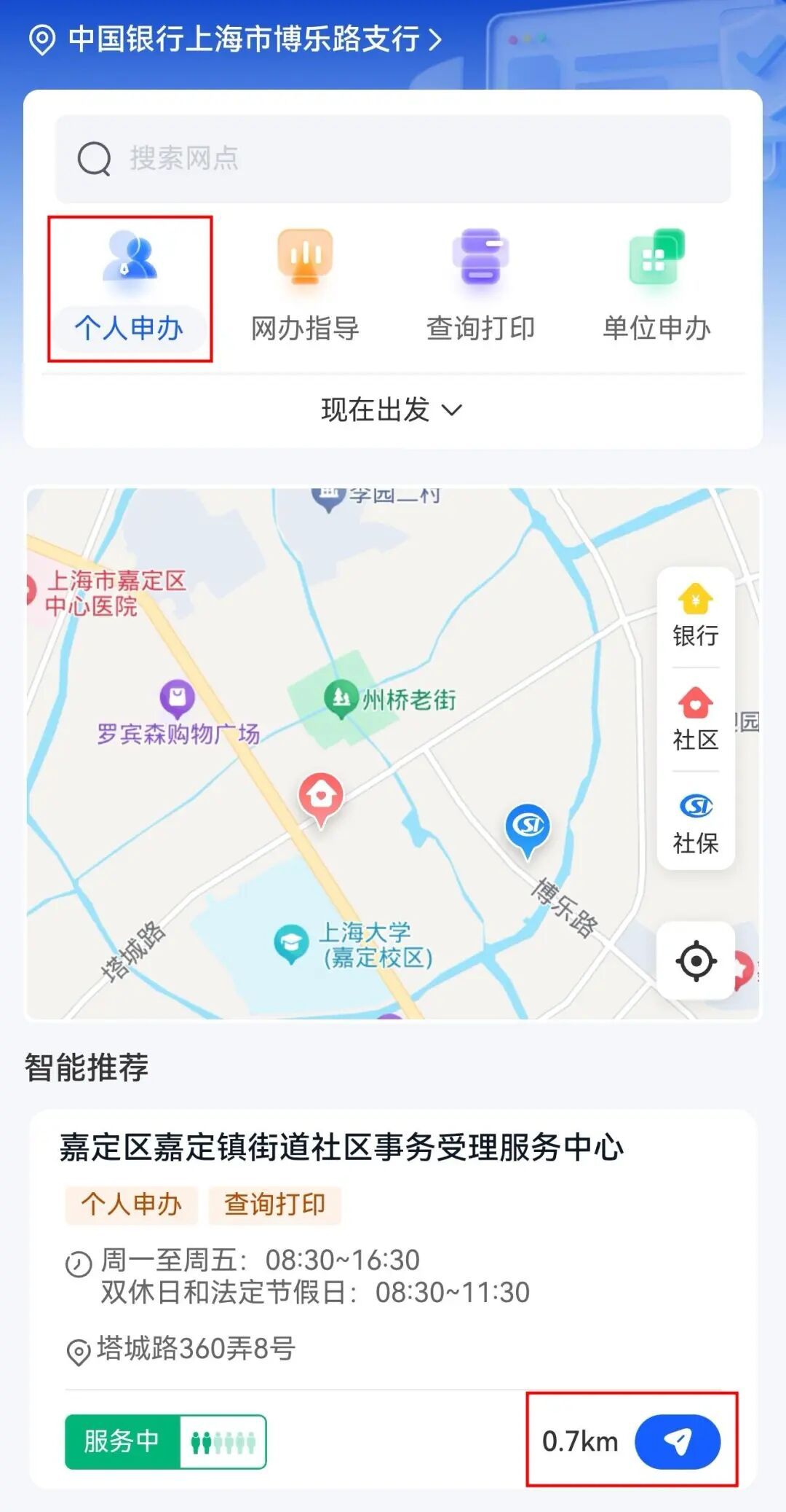 进入“社保地图”后,点击“个人申办”,系统为您智能推荐就近网点,点击网点信息右下角,即可一键导航!