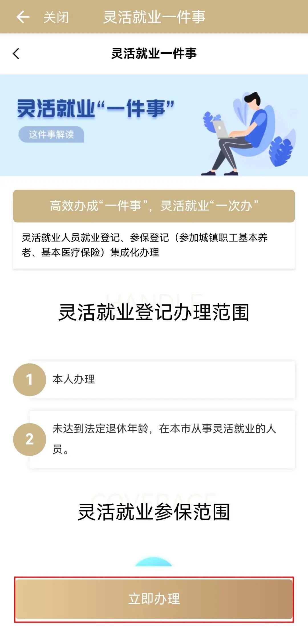 登录“随申办市民云”APP,搜索并进入“灵活就业一件事”应用服务,点击“灵活就业登记参保”,阅读“灵活就业登记办理范围”“灵活就业参保范围”和“办理流程”后,点击下方【立即办理】,即可进入办理页面: