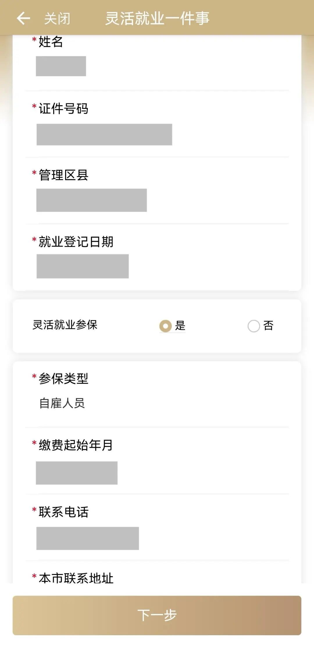 核对【姓名】【证件号码】【就业登记日期】信息后,根据本人实际情况,选择对应【管理区县】,并在【灵活就业参保】选项内选择【是】后,系统将自动生成缴费起始年月,补充本人【联系电话】【本市联系地址】后,点击“下一步”。