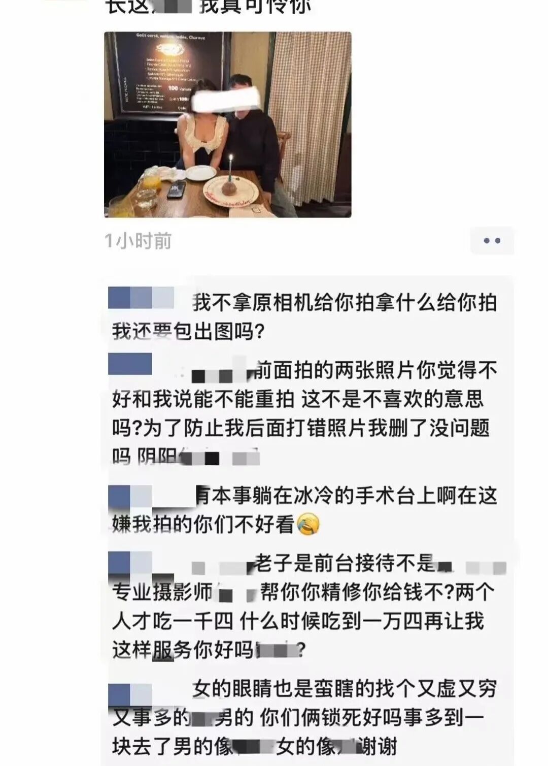 网传的截图显示,该服务员发布的文字颇为不雅,“两个人才吃一千四,什么时候吃到一万四再让我这样服务你好吗?”“长这X样我真可怜你”“老子是前台接待不是专业摄影师……”
