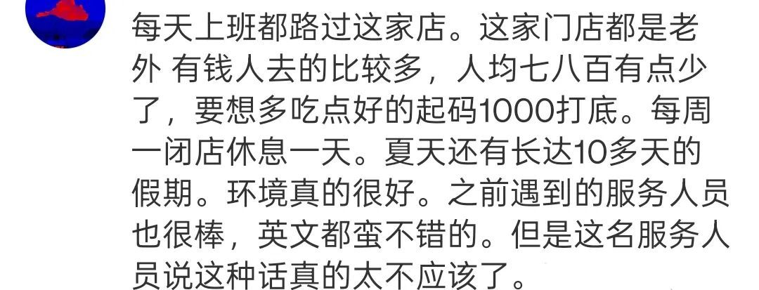 不管是千元大餐还是平价快餐,服务的核心都是尊重。餐饮卖的不只是美食,更是如美食般服务的体验。这次事件里,服务员不仅没做到尊重顾客、保护隐私,还把职业尊严和消费金额绑在一起,职业素养堪忧。