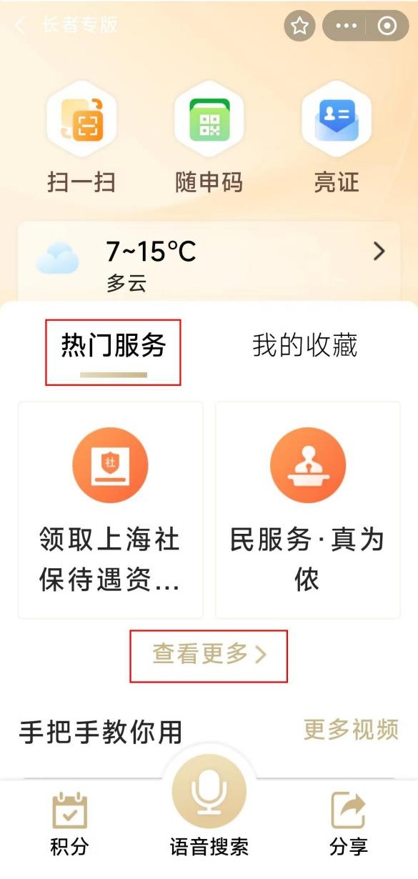 ①第一步:打开“随申办”小程序或App,点击右上角“+”,选择“长者专版”。