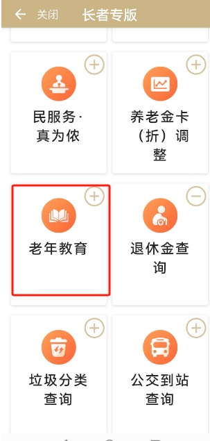 ②第二步:进入长者专版后,找到“热门服务”“查看更多”,点击后选择“老年教育”并点击。