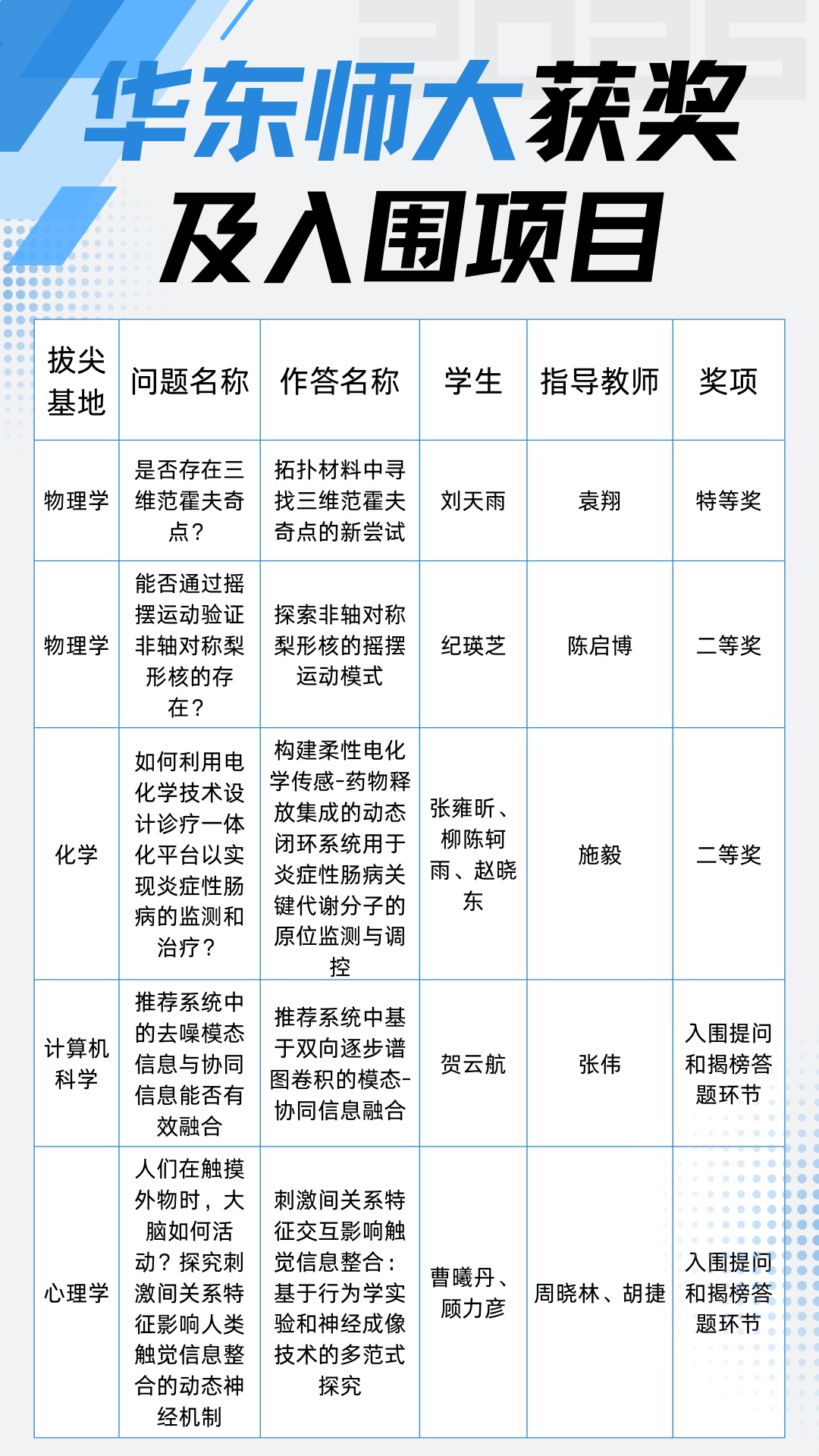 1月15日,教育部第四届“提问与猜想”活动线下评审展示交流会在清华大学举行。华东师大拔尖基地学子在竞争最为激烈的“自主探索板块”中斩获佳绩,共荣获特等奖1项(该板块全国仅2项)、二等奖2项,另有2项入围提问和揭榜答题环节,创下历史最佳成绩。值得一提的是,这已是学校第二次问鼎特等奖。