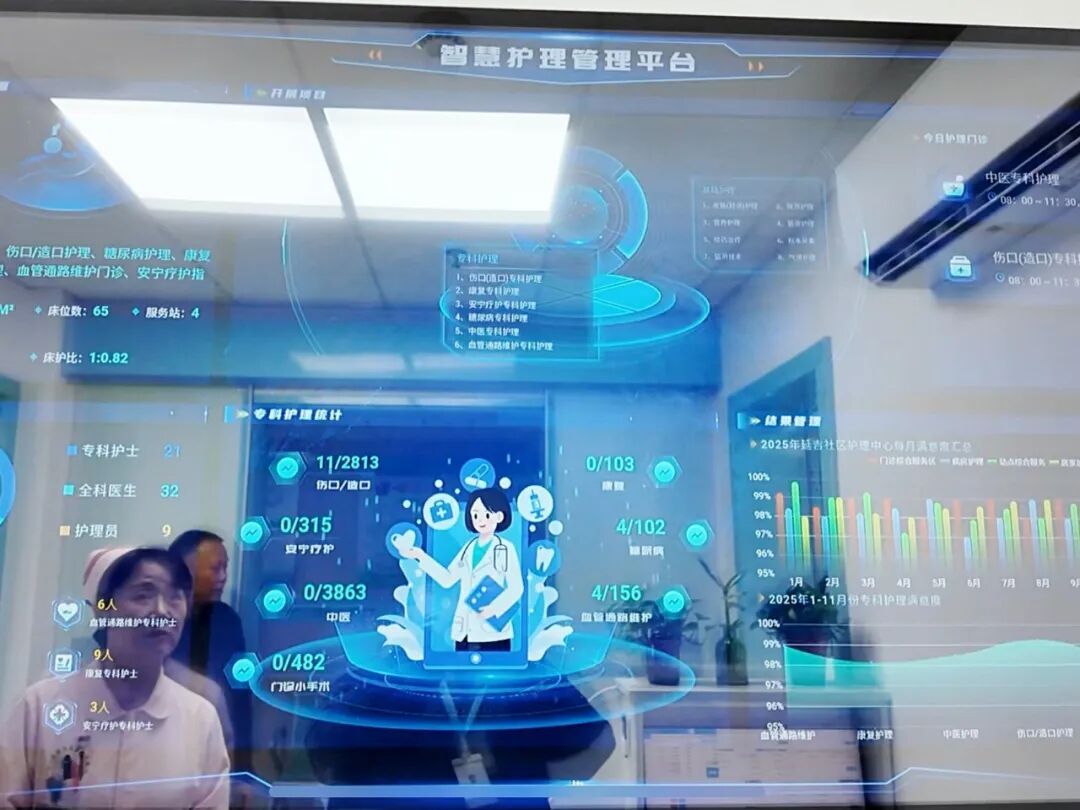 在杨浦区延吉社区卫生服务中心的护理中心内,患者正通过电子医保卡取号排队,等候区屏幕上播放着由本院护士们自编自导的科普视频。诊室内,专科护士细致地为患者进行伤口护理,开展糖尿病饮食指导。如今,这样的场景不仅出现在延吉社区,还覆盖了控江、江浦、四平、新江湾城、长海等社区。2025年,杨浦区将“建设5家社区护理中心”列为实事项目,目前已全面完成建设并投入服务,推动优质护理资源持续下沉,让居民在“家门口”获得便捷、专业的专科护理照护。