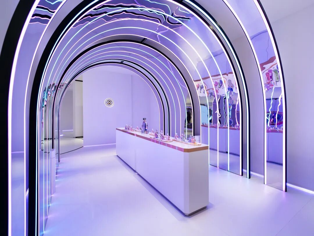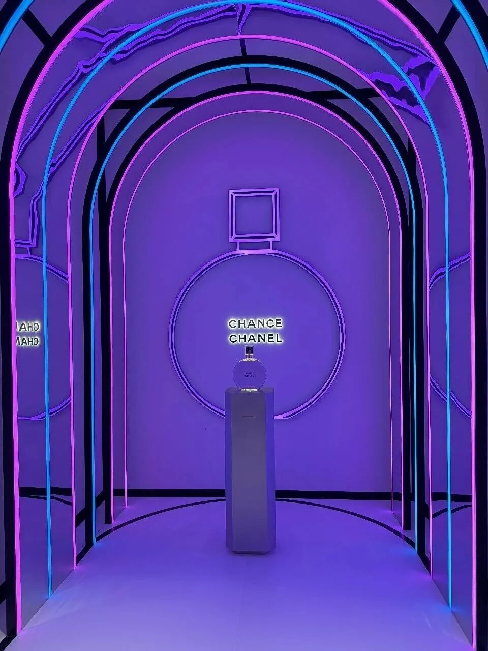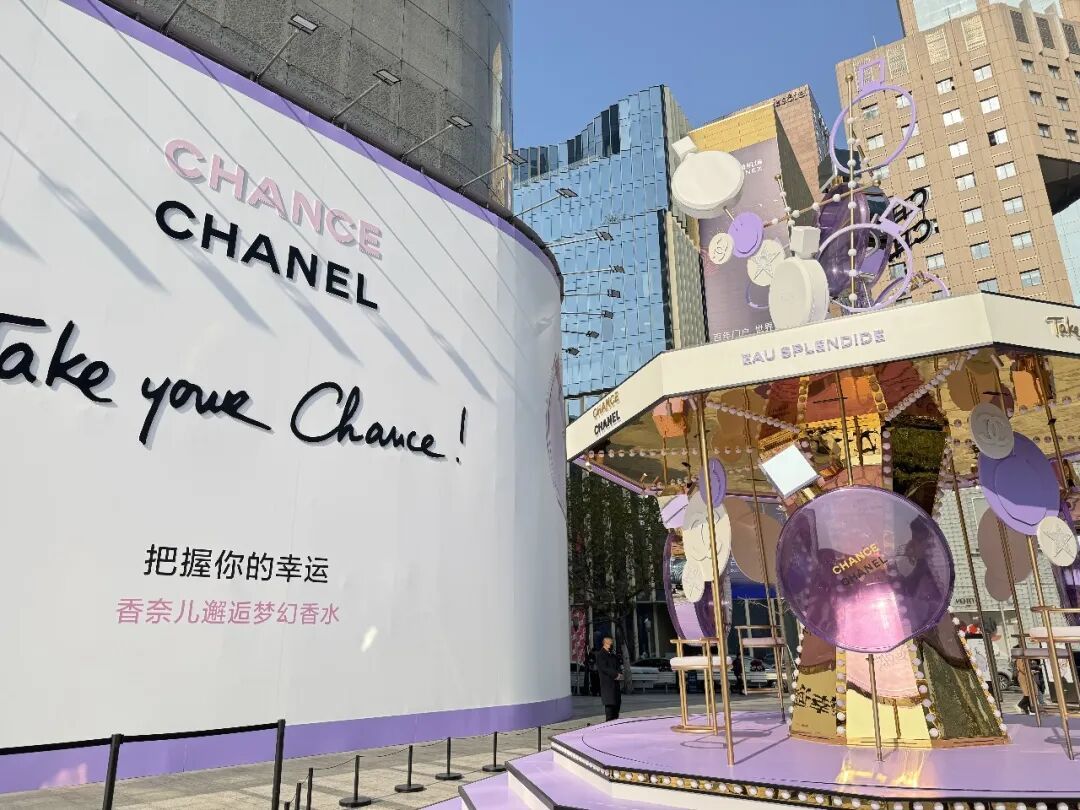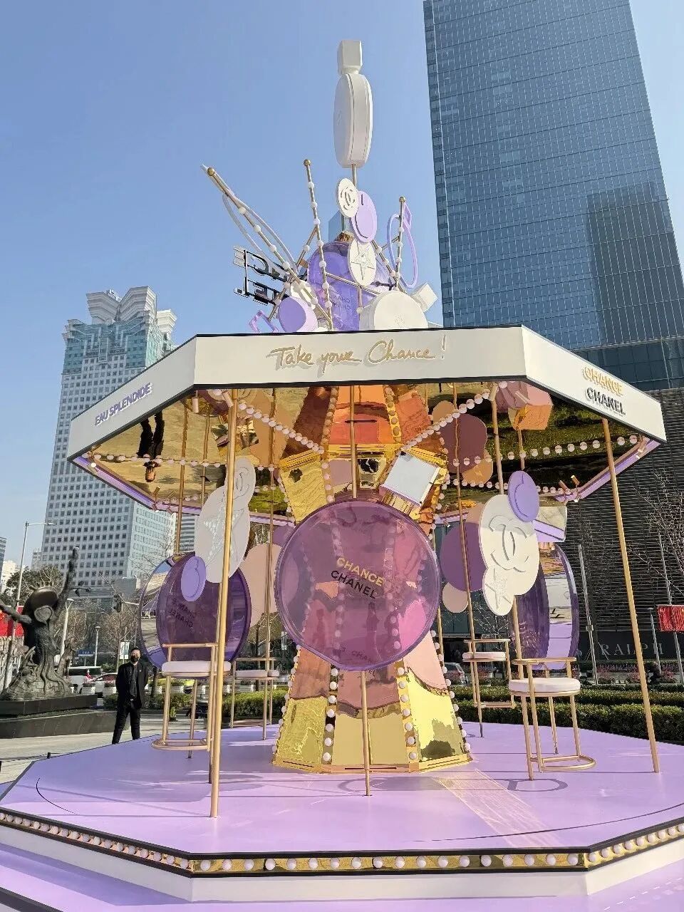 这座以香奈儿邂逅梦幻香水为灵感打造的艺术装置,巧妙融合了品牌标志性的圆形瓶身元素,紫金配色营造出灵动闪耀的视觉效果,呼应“Take your Chance!把握你的幸运”主题。