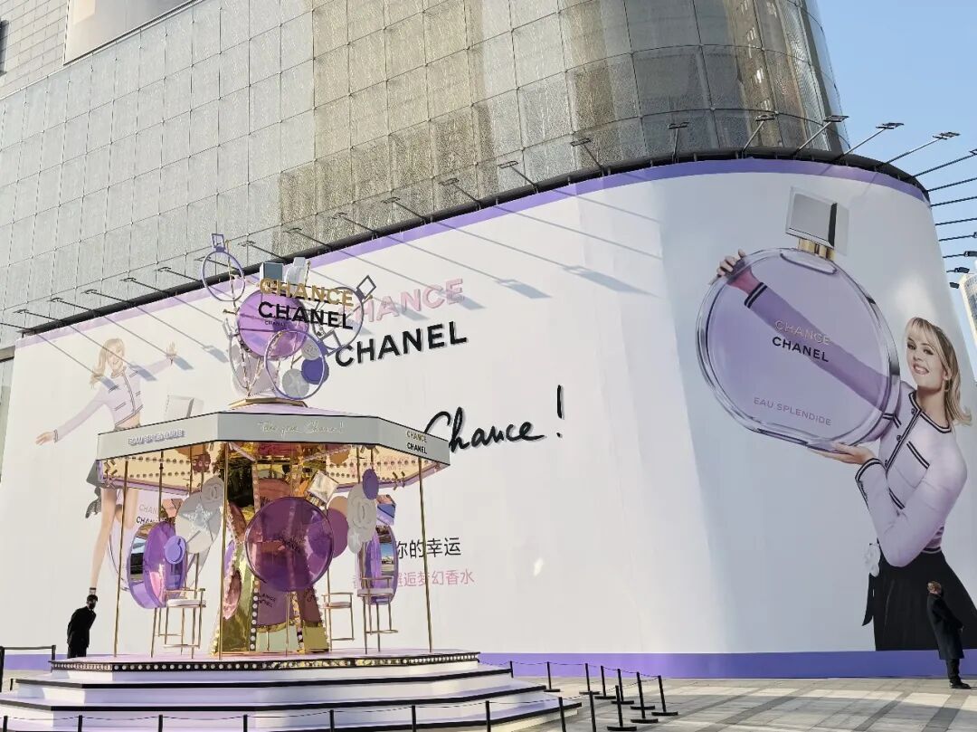 在芮欧百货达利钟广场,一座旋转木马装置惊艳亮相,与背后的巨幅外立面广告牌一起,形成强烈的视觉冲击,成为“邂逅梦幻 香奈儿香水空间”的视觉焦点,十分吸睛。