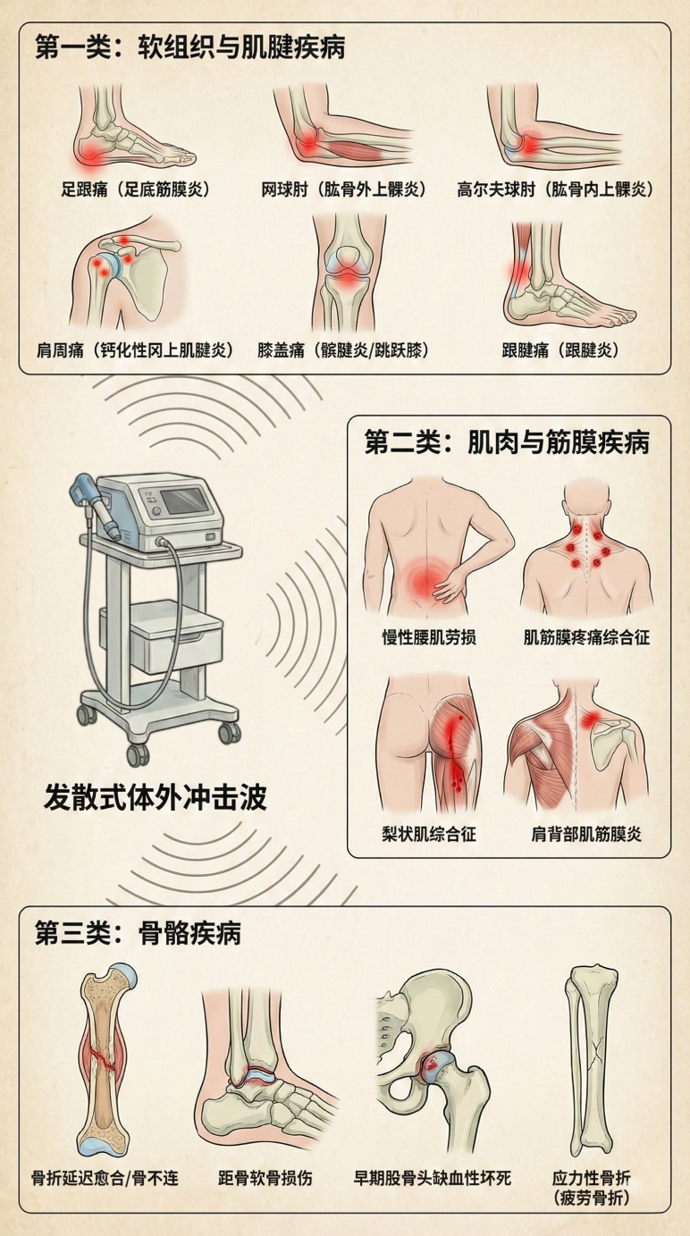 这类疾病通常由长期劳损导致,表现为特定动作下的牵拉痛或锐痛。 1、足跟痛(足底筋膜炎) 典型症状:早晨起床下地第一步剧痛,像踩在钉子上,走几步后反而减轻。 2、网球肘(肱骨外上髁炎) 典型症状:手肘外侧疼,拧毛巾、提壶倒水、拎重物时手肘酸软无力。 3、高尔夫球肘(肱骨内上髁炎) 典型症状:手肘内侧疼,用力屈手腕(如切菜、抱孩子)时疼痛明显。 4、肩周痛(钙化性冈上肌腱炎) 典型症状:肩膀里长了“小石头”(钙化点),夜间痛醒,胳膊很难抬高穿衣梳头。 5、膝盖痛(髌腱炎/跳跃膝) 典型症状:上下楼梯或半蹲发力时,膝盖骨下方感到锐痛。 6、跟腱痛(跟腱炎) 典型症状:脚后跟上方变粗、肿胀,跑步蹬地时疼痛。 这类疾病主要涉及肌肉的紧绷、僵硬和广泛性酸痛,常伴有按压剧痛的“结节”。 1、慢性腰肌劳损 典型症状:腰两边的肌肉像板砖一样硬,久坐或弯腰干活后酸痛加重,按摩也很难缓解深层。 2、肌筋膜疼痛综合征 典型症状:肩颈或背部有明显的“痛点”或硬结,按一下痛得想跳起来,甚至会传导到别的地方。 3、梨状肌综合征 典型症状:臀部深处酸痛,有时像触电一样放射到大腿后侧,常被误认为是腰突。 4、肩背部肌筋膜炎 典型症状:肩胛骨缝隙里总觉得沉重、酸胀,像背了一块大石头。 这类主要针对骨骼愈合困难或缺血性坏死的问题。 1、骨折延迟愈合/骨不连 典型症状:骨折过了好几个月还没长好,断端硬化(冲击波可作为手术植骨外的补救方案)。 2、距骨软骨损伤 典型症状:脚踝扭伤后深处的长期隐痛。 3、早期股骨头缺血性坏死 典型症状:仅限I期和II期,旨在改善股骨头血供,延缓塌陷。 4、应力性骨折(疲劳骨折) 典型症状:骨骼因过度使用出现的细微裂纹(如长跑运动员的胫骨痛)。