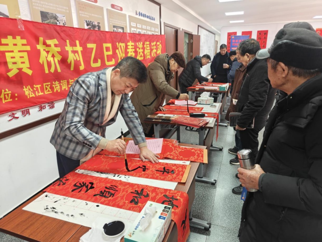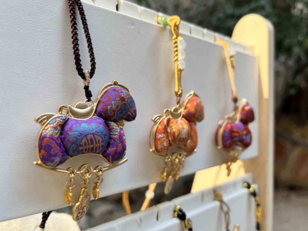 松江区将琴韵化入丝缕,以非遗宋锦为原料,手工制成项链、吊坠、胸针、发簪等配饰,黄桥村带来特色楹联作品,以笔墨传递民俗文化与美好祝愿。