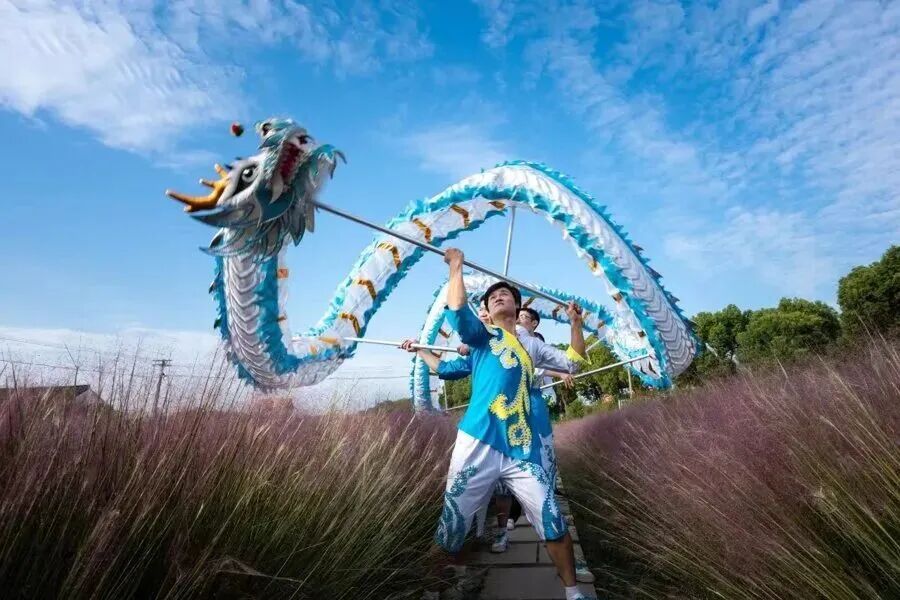 金山吕巷小白龙表演灵动俏皮,舞者身着彩衣,伴着欢快旋律穿梭市集,龙身翻飞间仿佛行云流水,寓意着风调雨顺、吉祥如意。