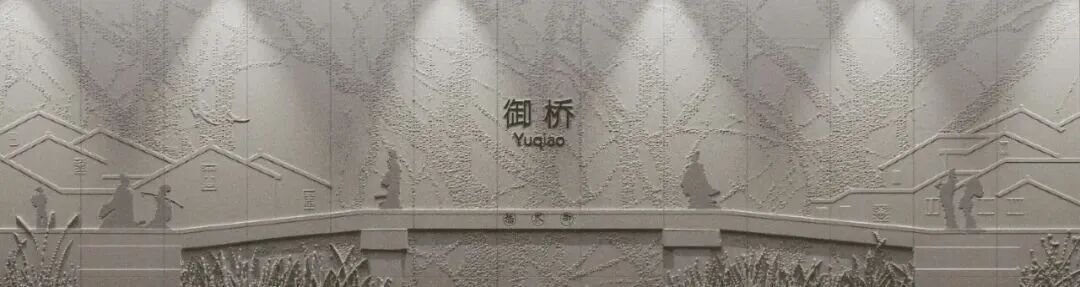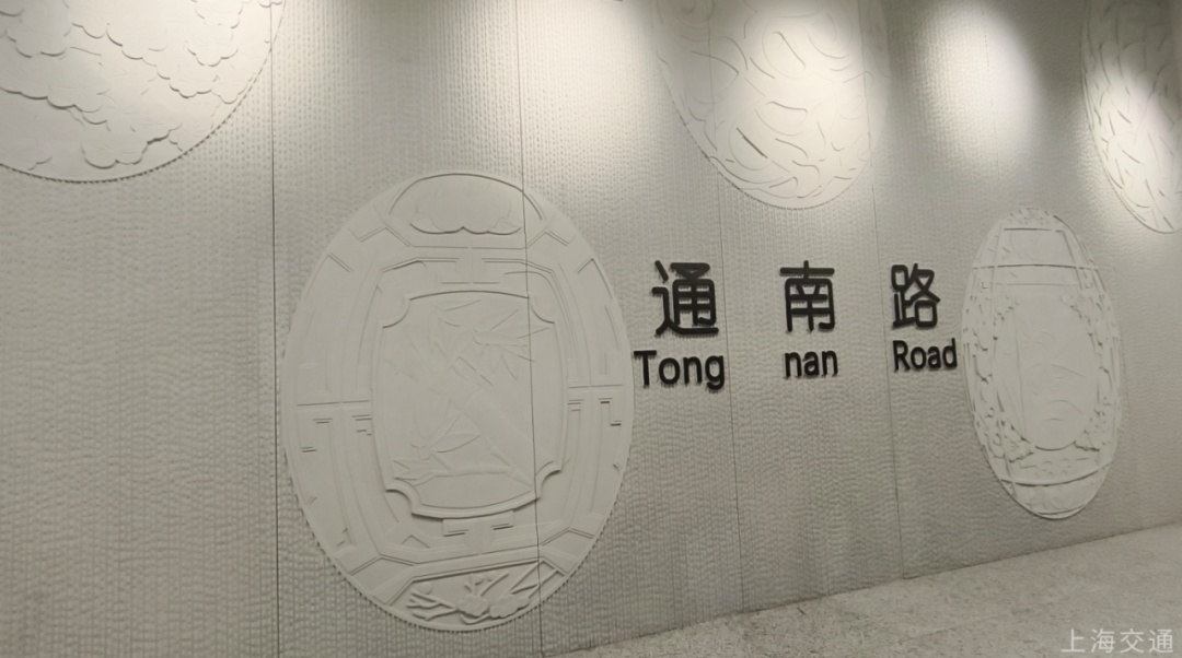 通南路站主打暖浅木色,温润舒适,站名墙浮雕呈现传统淞南蛋雕非遗技艺。