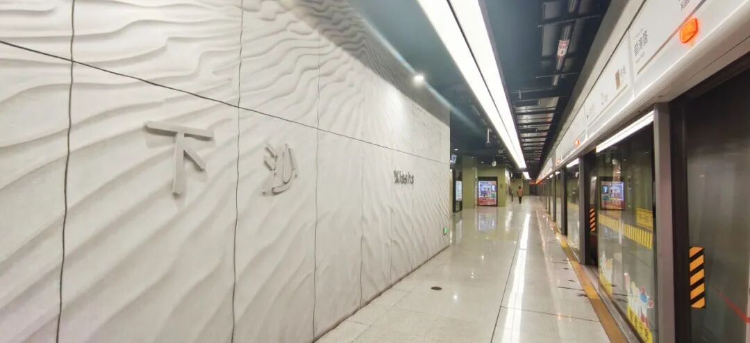 江杨南路站(暂不开通)通过大型LED灯块,形成五光十色的撞色空间;站名墙以型钢厂旧址风貌,传承钢城精神,延续工业历史记忆。